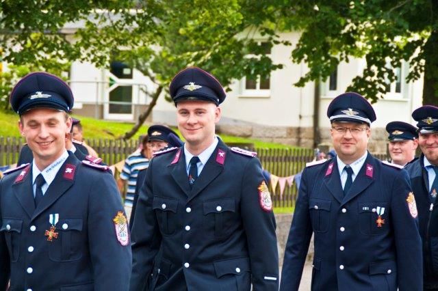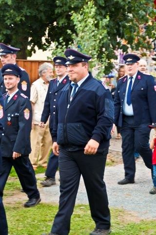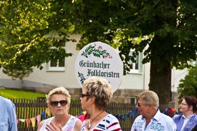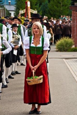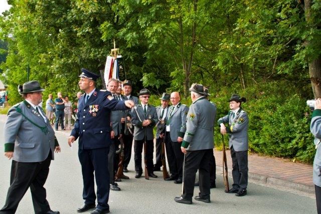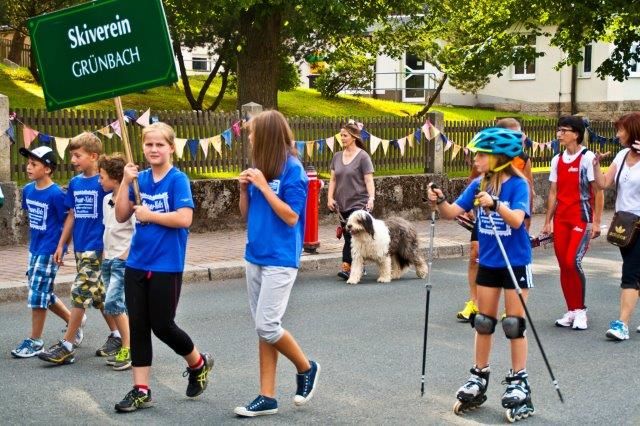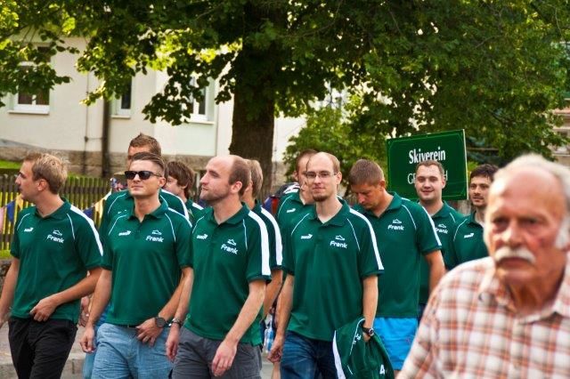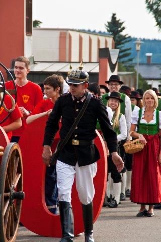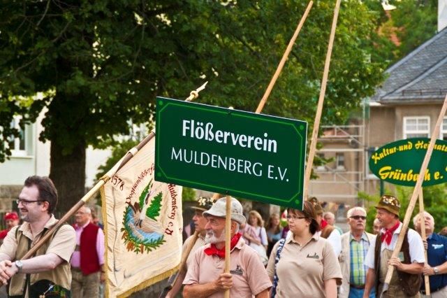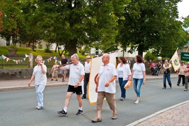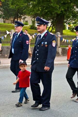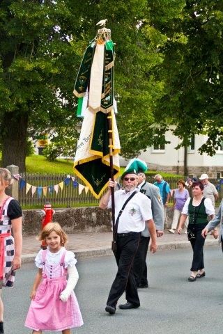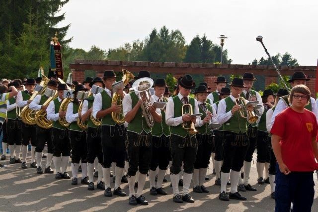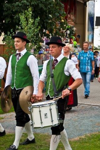 Und er beginnt immer mit dem traditionellen Kirmesumzug vom Kinderspielhaus zum Festgelände. Vor Jahren wurde der Umzug fast auf die Streichliste gesetzt, den nur noch wenige Grünbacher und Muldenberger nahmen am Umzug teil. Das hat sich in den letzten Jahren deutlich geändert und in diesem Jahre wurde der Umzug zur "Machtdemonstration" des Ortsvereinslebens! Alle waren in großer Schar gekommen. Ob Kindergarten, Schule, Sport, Gewerbe- oder Kulturverein, Folkloristen, Schützen, Flößer oder Feuerwehr - über 200 Teilnehmer marschierten zur hervoragend aufspielenden Blaskapelle unserer österreichischen Freunde mit Bürgermeister und Gemeinderat gen Sportplatz.