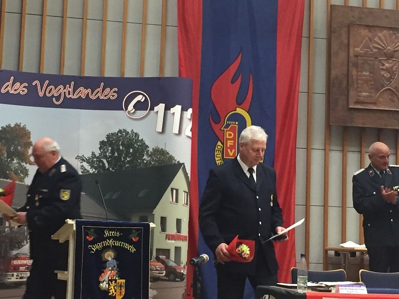 Glückwünsche erhielten auch die Kameraden Wolfgang Jahn FF Oelsnitz) und Jörg Pöker (Berufsfeuerwehr Plauen) vom Vorstand des KFV. Beide wurden mit der Verdienstmedaille des KFV in Silber ausgezeichnet!