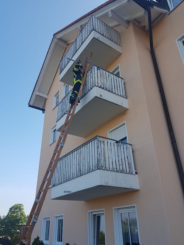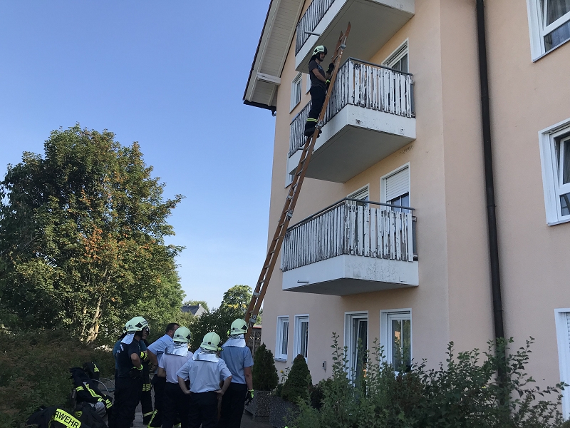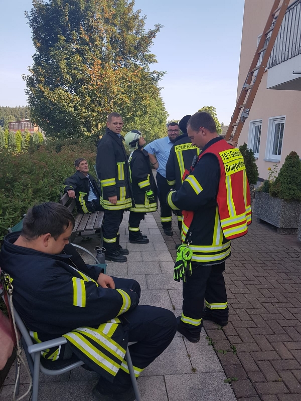Der Umgang mit den Einsatzleitern des Löschfahrzeuges stand auf dem Ausbildungsplan. Dienstverantwortlicher Tiemo Pöhler hat sich in diesem Jahr das Seniorenzentrum ausgewählt. Dort galt es sowohl die 3-teilige Schiebeleiter, als auch den Steckleitersatz am Gebäude in Stellung zu bringen. Mit dem ersteren Leitersatz erreicht man das 3. Obergeschoß, mit der Steckleiter das Zweite.