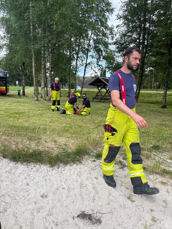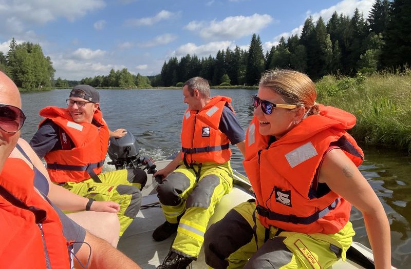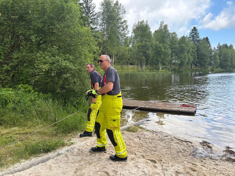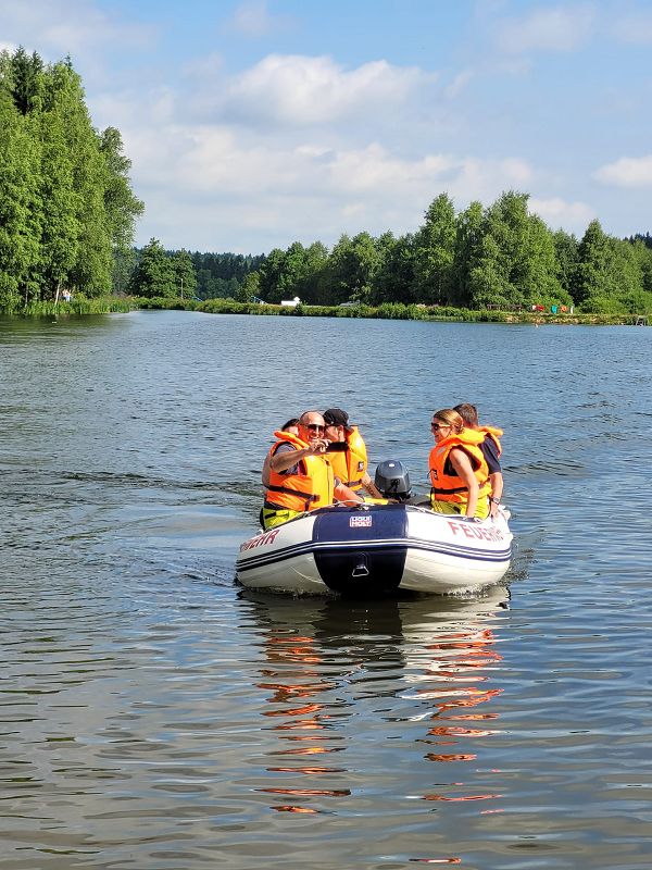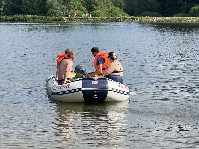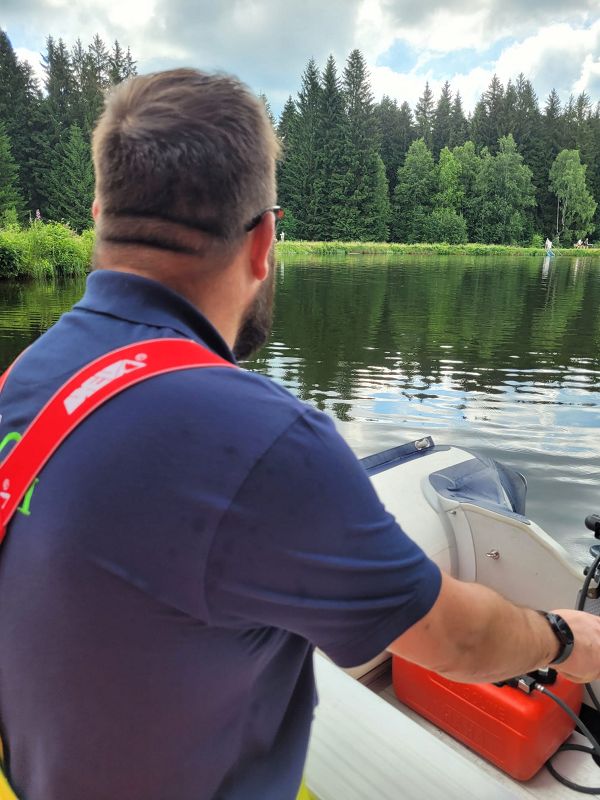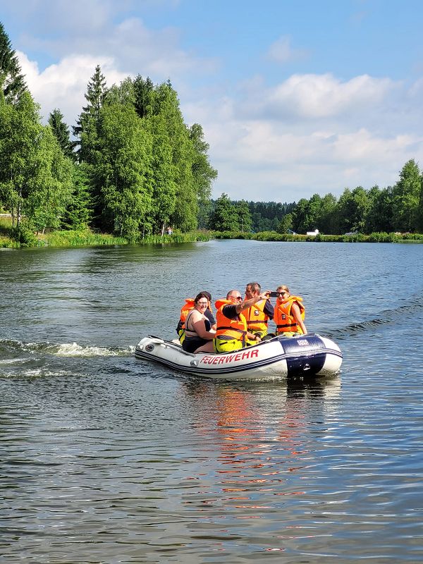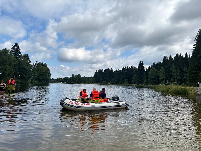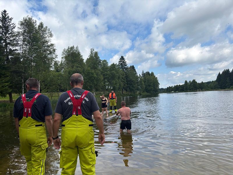 Wenn am frühen Morgen schon 25 Grad herrschen, die Sonne vom blauen Himmel lacht, zieht es viele Badegeister in die Bäder und an die Seen. Einen sehr beliebten See hat die Gemeinde Grünbach in ihrem Ortsteil Muldenberg. Den "Mulleteich". Und die ersten Badehungrigen zog es dann auch schon an diesem frühen Morgen an den See. Auch die Feuerwehr Grünbach war an diesem Morgen am See, doch ein Badeausflug war es nicht. Die Ausbilder der Feuerwehr hatten die Ausbildung mit dem Schlauchboot der Feuerwehr angesetzt. Bestes Schlauchbootwetter also. Zunächst sollten Personen von einem havarierten Holzfloß evakuiert werden, was auch prima gelang. Dann sollte eine Schlauchbootbesatzung das havariert Floß vom Senn an das Ufer geschleppt werden. Auch diese Aufgabe war für Besatzung und Boot kein Problem.