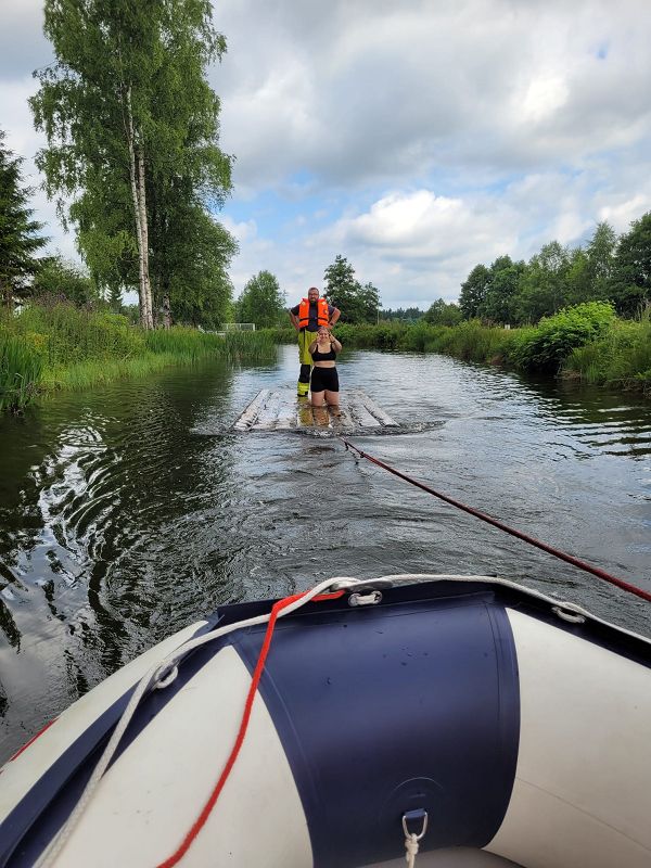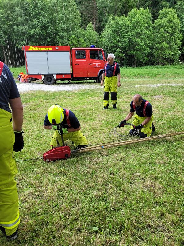 Da das Floß Schäden aufweist, sollte es für Reparaturzwecke an Land gezogen werden. Zunächst versuchten es die Kameraden mit dem "Ruck-Zuck" einem kleinen Greifzug mit Stahlseil. Trotz dem Einbau einer Umlenkrolle war die Last des Floßes nicht wirklich zu bewegen. Erst das Schleppen mit dem Löschfahrzeug war von Erfolg gekrönt und liegt nun sicher am Ufer, kann somit von den Verantwortlichen repariert werden.