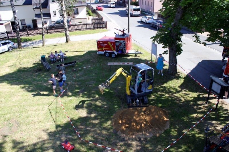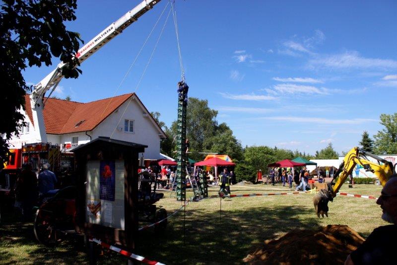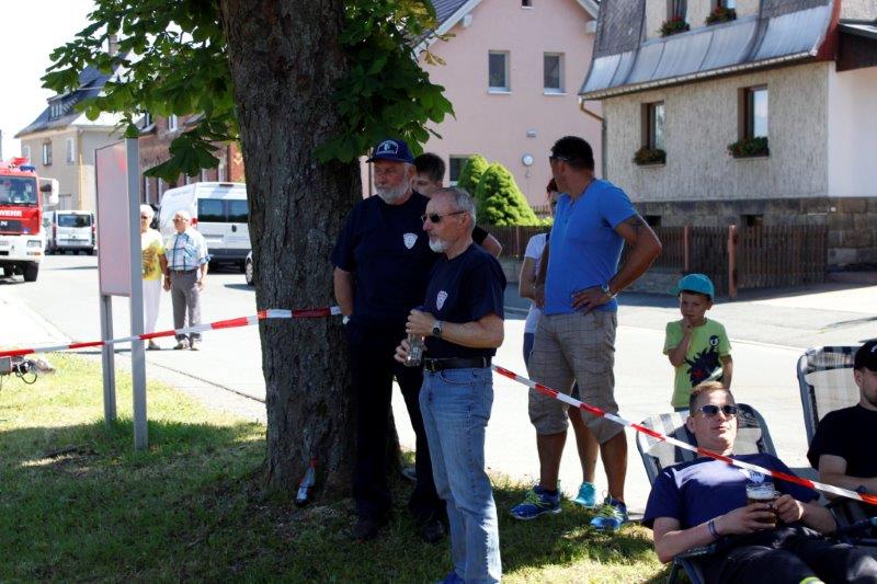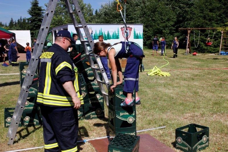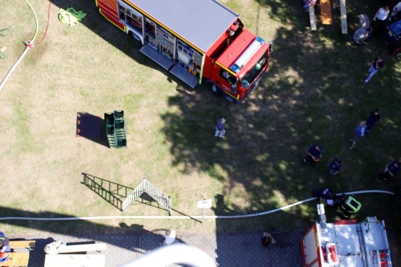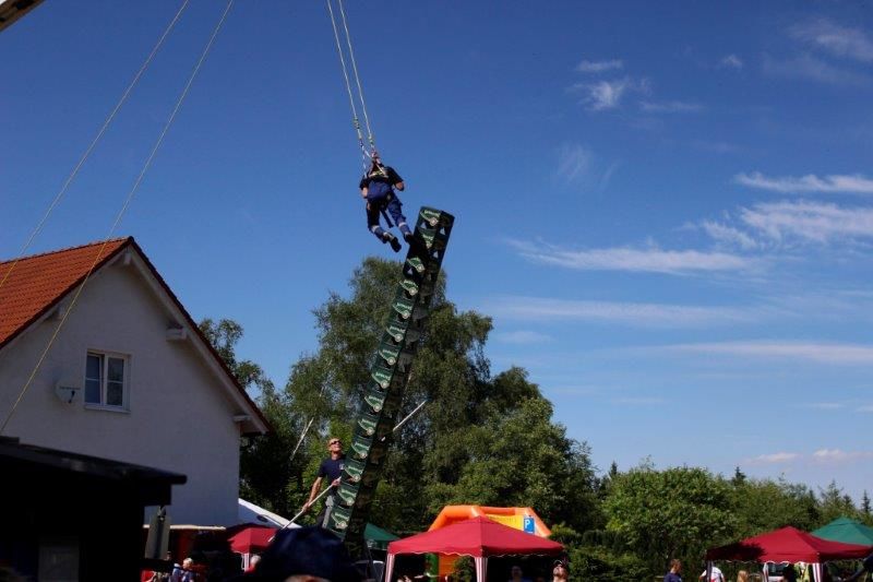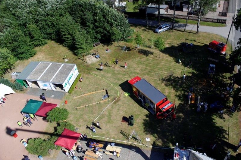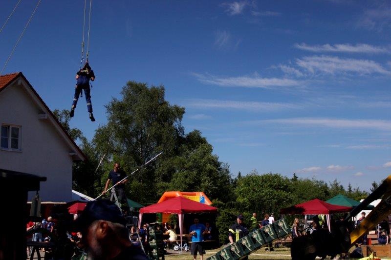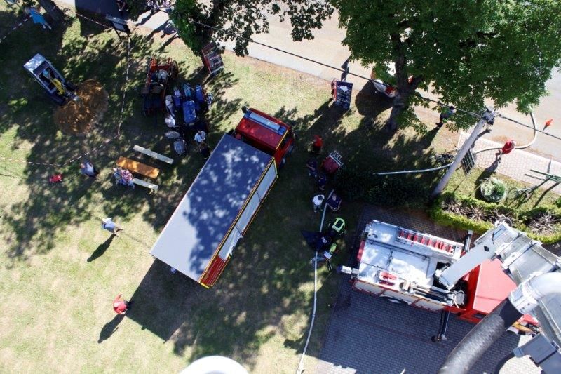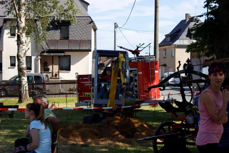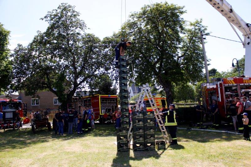 Die Falkensteiner Feuerwehr war mit ihrer Drehleiter da und jeder durfte sein Können beim Bierkastenklettern versuchen, dass am Ende Ricardo Behlke mit 25 Kästen gewann. Die Muldenberger Feuerwehr war mit 4 Kameraden zu Rundfahrten bereit und auch die Grünbacher warfen jeden Kameraden in den Ring" der greifbar war!