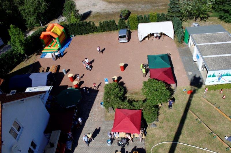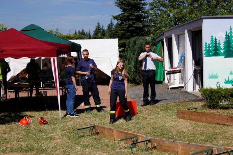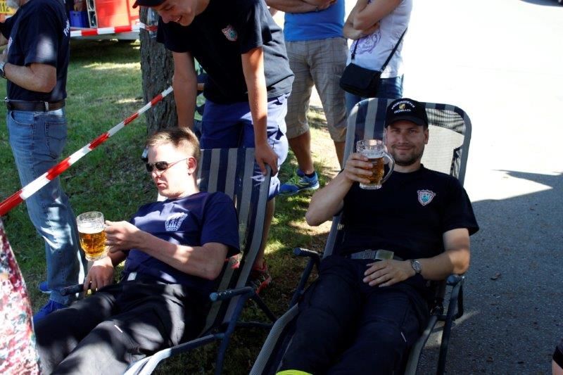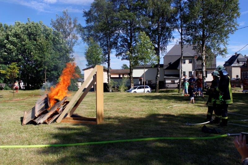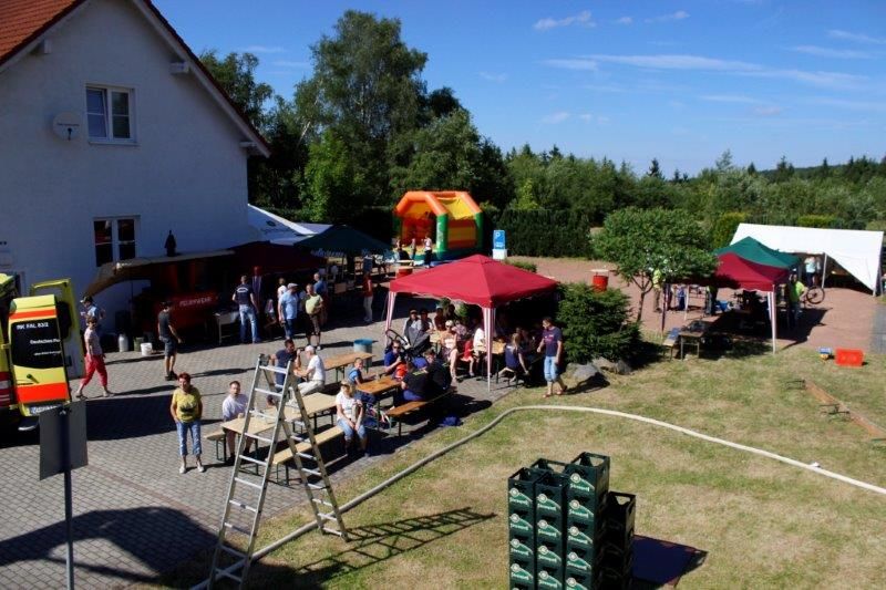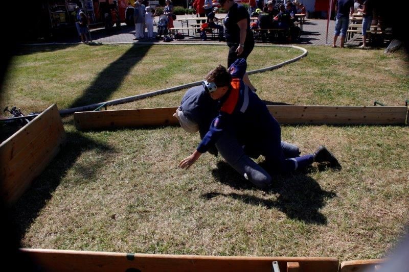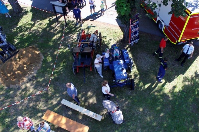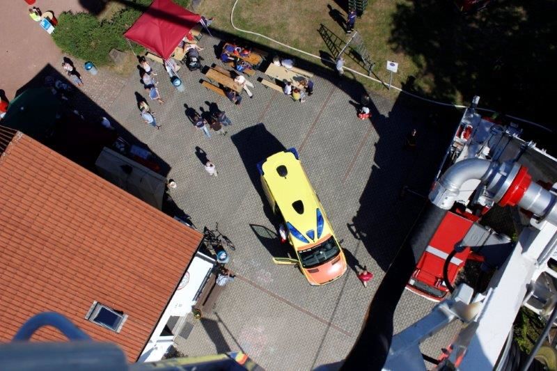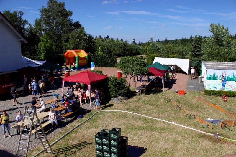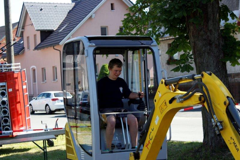 Die Falkensteiner Feuerwehr war mit ihrer Drehleiter da und jeder durfte sein Können beim Bierkastenklettern versuchen, dass am Ende Ricardo Behlke mit 25 Kästen gewann. Die Muldenberger Feuerwehr war mit 4 Kameraden zu Rundfahrten bereit und auch die Grünbacher warfen jeden Kameraden in den Ring" der greifbar war!
