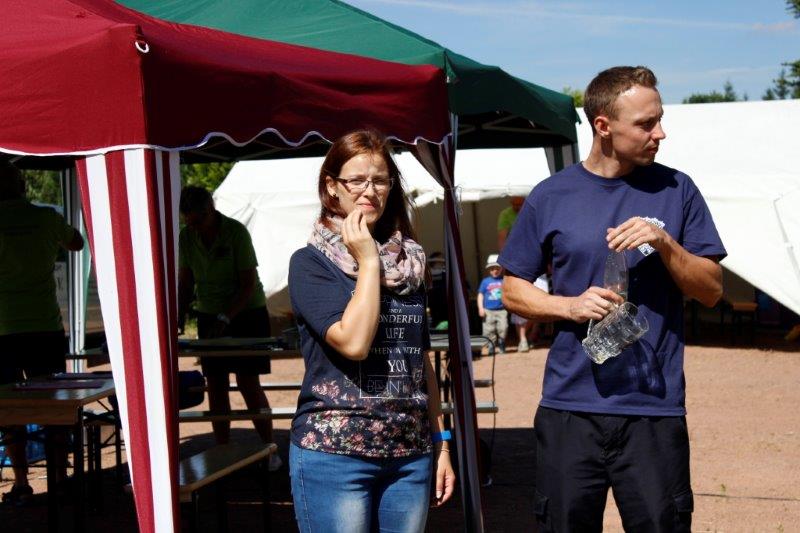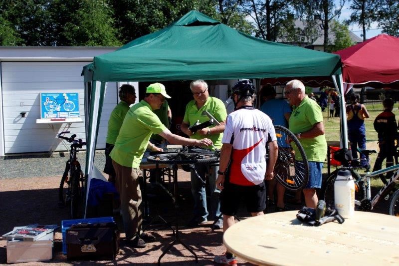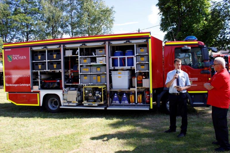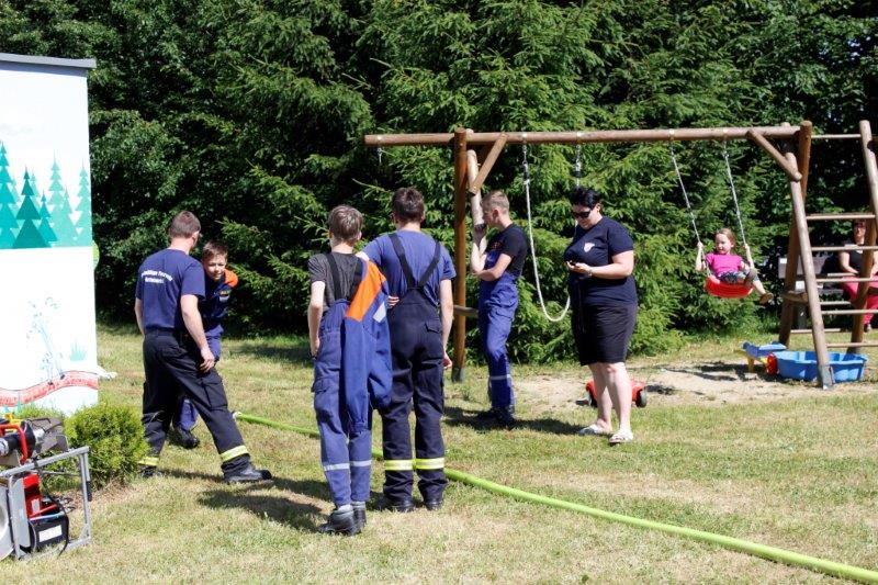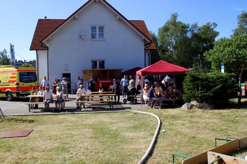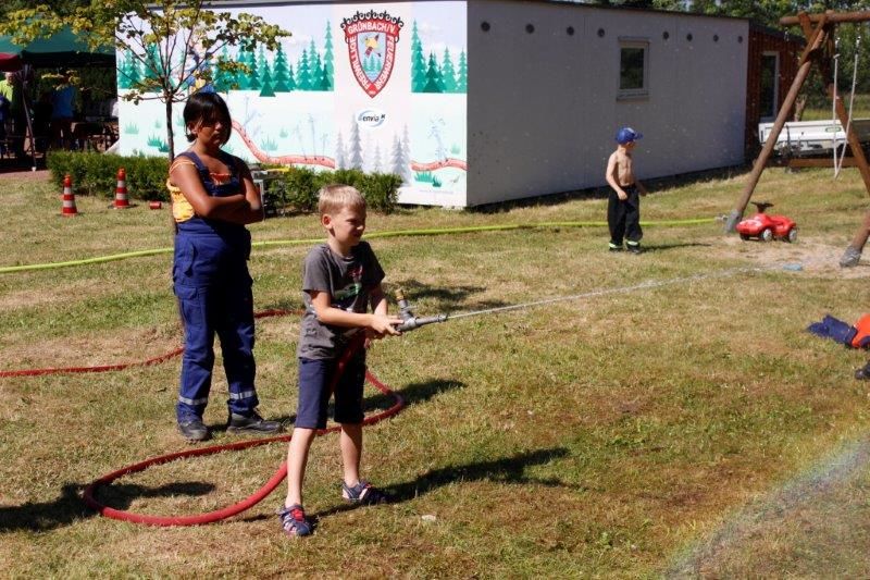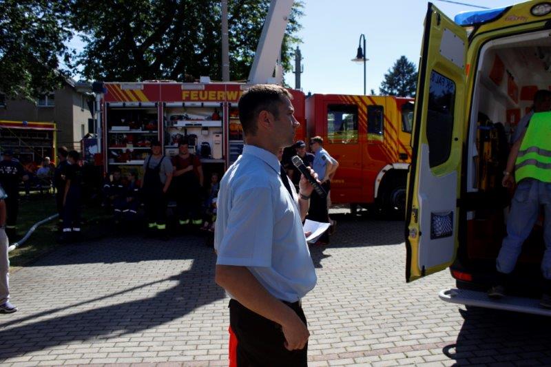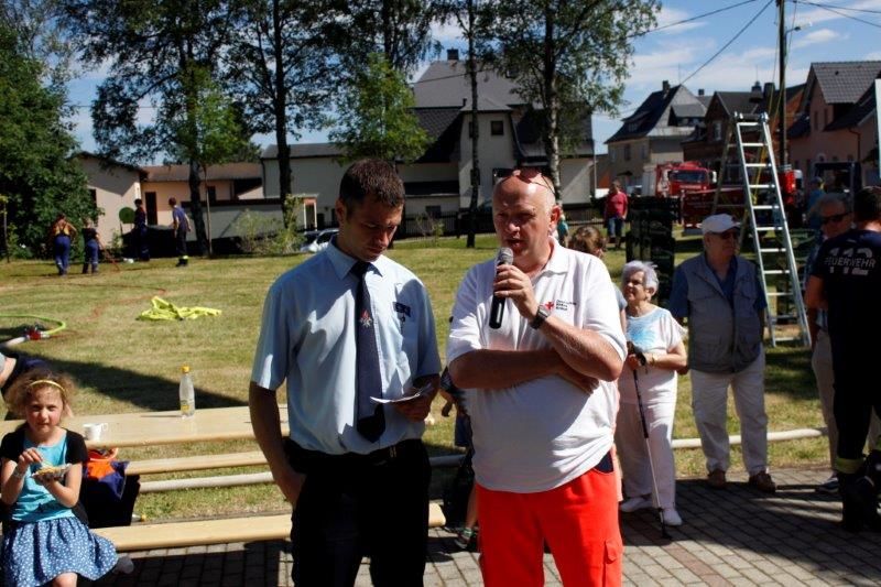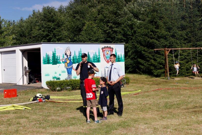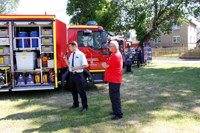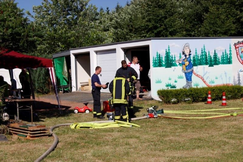 Dabei hatten sich die Organisatoren um Wehrleiter Michael Breitfeld sichtlich bemüht, ein Veranstaltungsprogramm für den Nachmittag zusammen zu stellen, was so die Gäste und auch dei Grünbacher Bürger nicht kannten. Viele der eingeladenen Gäste kamen in ihrer Freizeit zu uns und wollten nicht nur über Ihre Arbeit und ihre Technik berichten, sondern auch den Grünbacher Kameraden bei ihrer Festgestaltung helfen. So nahmen sich 4 Mitarbeiter der Diakonie mit einem Mal- und Bastelstand für uns Zeit. Die Verkehrswacht kam mit 3 Mitarbeitern um Sehtests und die Fahrradcodierung durchzuführen. Die Markneukirchener Kameraden waren zu 6 mit ihrem Gefahrgutwagen da und das DRK mit 4 Leuten und 2 Rettungswagen.