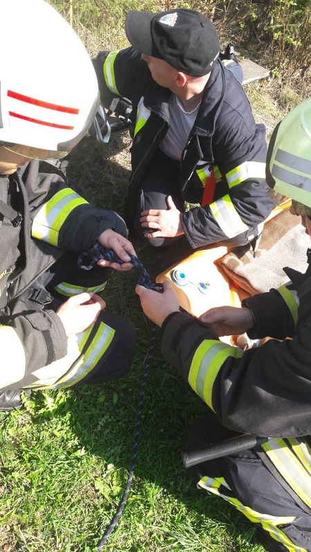 Zum Einsatz kam der neue Rettungssatz Absturzsicherung, die Schleiftrage und die Vakuummatraze, sowie eine Menge Karabiner und Seile.Die heute anwesenden Kameraden können nun bei einem ähnlichen Einsatz beruhigt zum Einsatz fahren, sie sind fit!