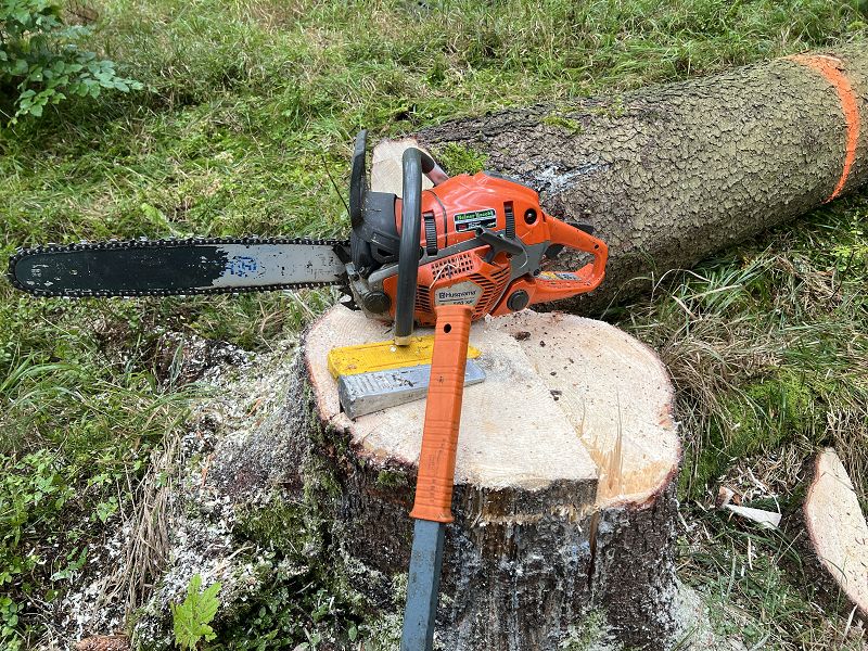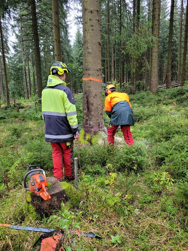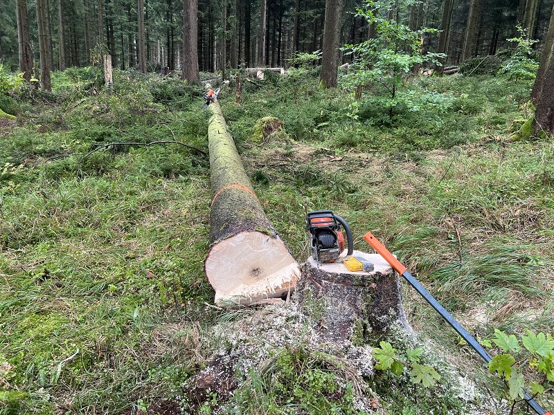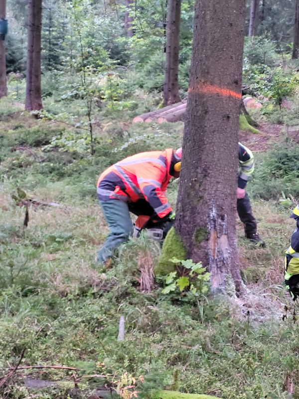 Es gehört zum Standardprogramm in der Jahresausbildung der Feuerwehren, so auch in Grünbach. Und doch ist die Ausbildung für die Sicherheit der Kameradinnen und Kameraden enorm wichtig, denn nur Wenige haben im Alltag ständig eine Kettensäge in der Hand. In diesem Jahr ging es tief in den Morgenröther Wald. Auf den Flächen des Sachsenforstes durften wir Großstammfichten fällen. Diese Fläche war auch für die Forstschüler vorgesehen und deshalb war es für uns besonders interessant, mal derartig ausgewachsene Bäume der Nutzholzaufbereitung zuzuführen.