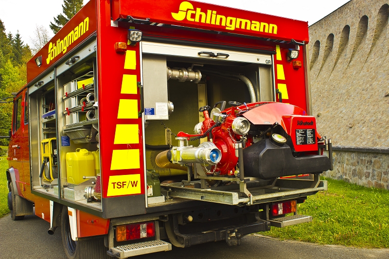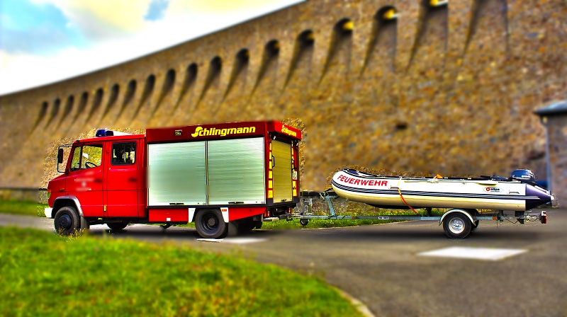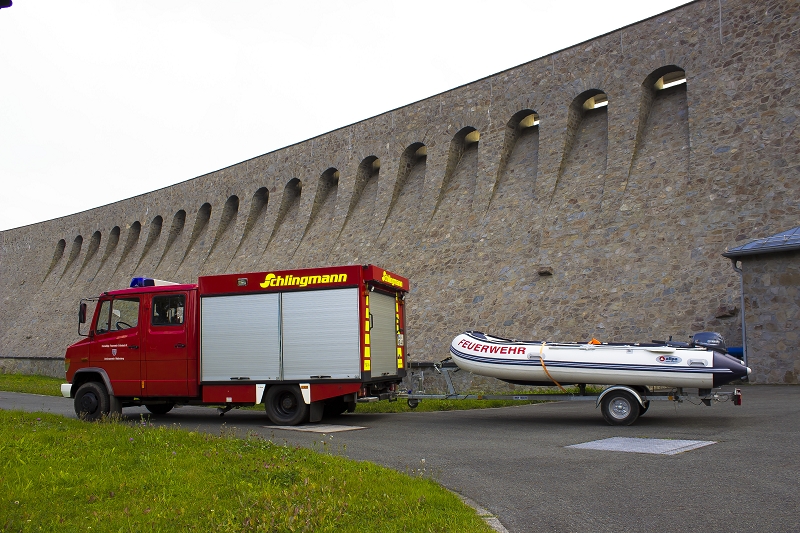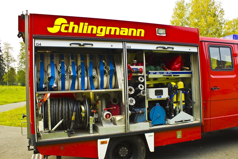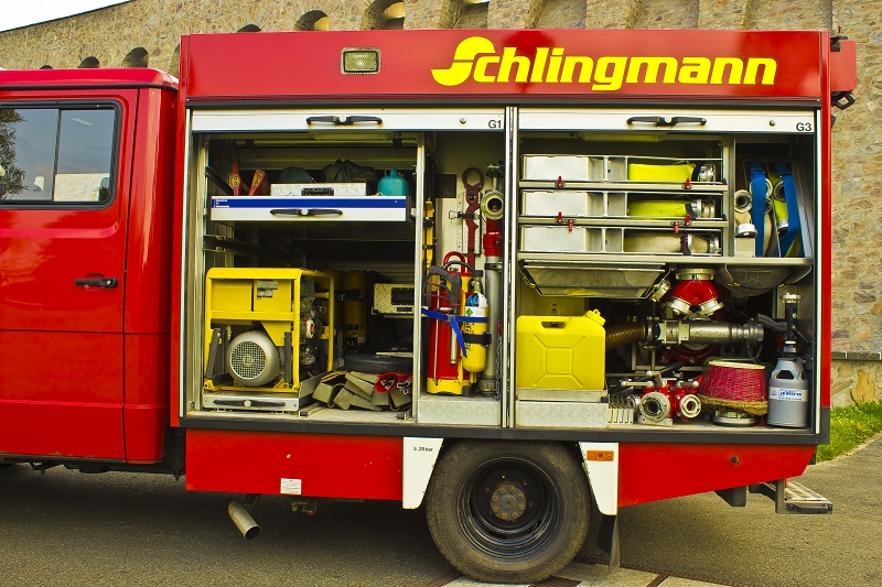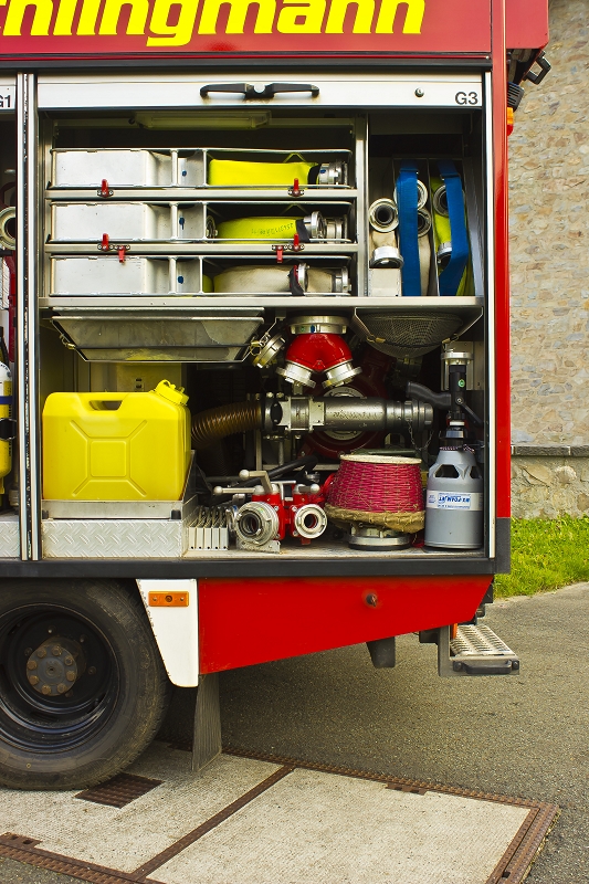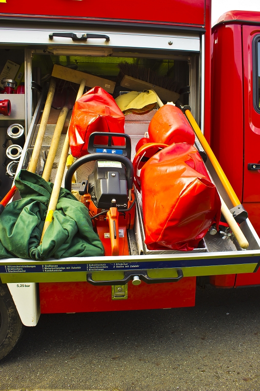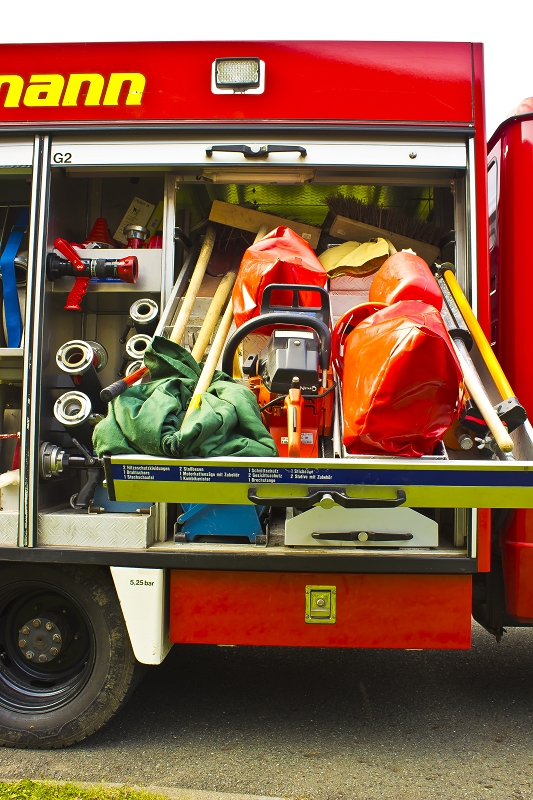 Schläuchen, Strahlrohren, Atemschutzgeräten, aber auch Komponenten der technischen Hilfeleistung, wie Kettensäge und Tauchpumpe verlastet.