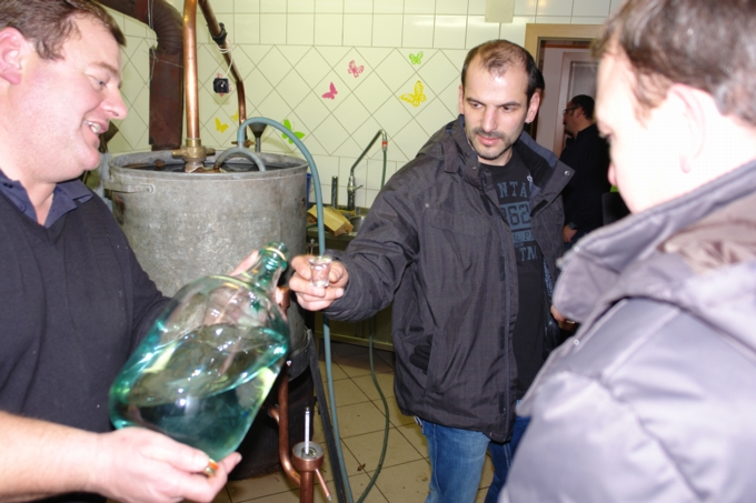 Dort wurden wir von Hannes (Johann Weinzinger), einem Bauern aus Lichtenau zur Schnapsverkostung mit anschließender Brett'l-Jause eingeladen. Ein Wahnsinnsabend! Der Schnaps tropfte frisch aus der Destille in die Gläser der Kameraden.