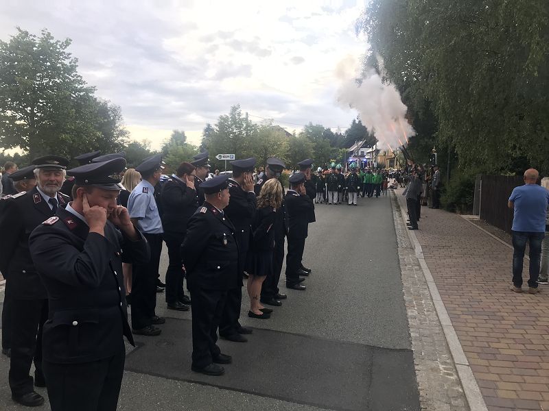 Bereits am Freitag Abend war vieles anders als sonst, als sich alle Umzugsteilnehmer zum Kirmesumzug formierten, wurden sie schon mit Blasmusik empfangen. Die Musikkapelle Grünbach spielte sich ein, um den imposanten Kirmesumzug aller Vereine zu führen. Und alle Vereine waren auch da. Nach dem Ausklingen der Kirchenglocken um 18:00 Uhr startete der Umzug mit drei Feuersalven aus den Waffen des Grünbacher Schützenvereins. Fast zweihundert Meter zog sich das bunte Band der Vereine durch unseren Ort - allen voran der Gemeinderat.