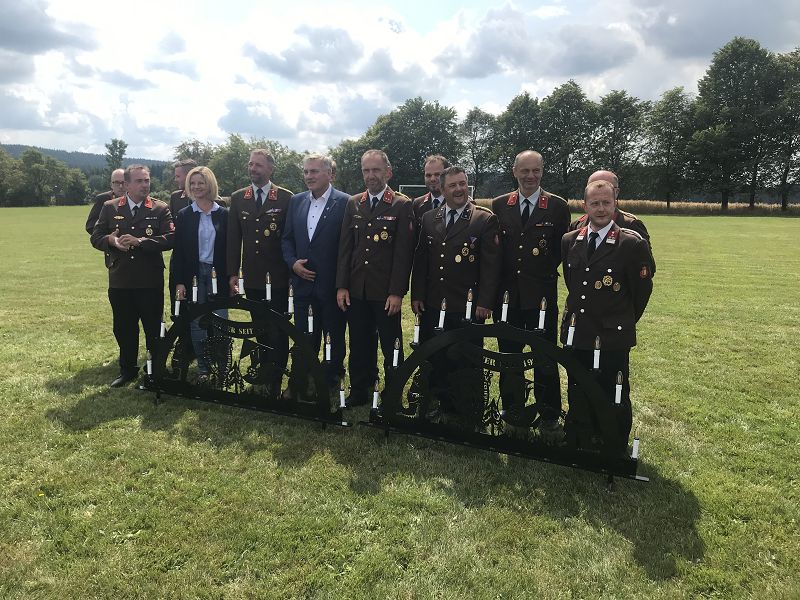 Als Zeichen der Verbundenheit beschenkten sich beide Feuerwehren mit einem Lichterbogen, der von Grafikdesignerin Sandy List vom Grünbacher Feuerwehrverein entworfen wurde und im Erzgebirge gebaut wurde.