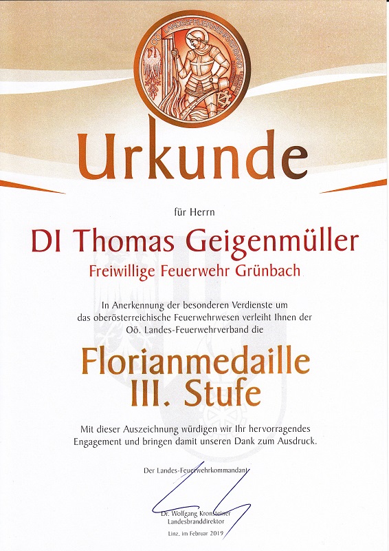 In der anschließenden Auszeichnungsveranstaltung dürfte unser Kamerad Thomas Geigenmüller ein hohe Ehrung vom Landesverband Öberösterreich entgegen nehmen. Er erhielt aus den Händen des neuen Bezirkskommandanten Brandrat Thomas Wurmtödter die Florianmedaille Stufe III.