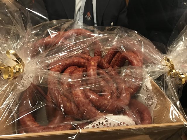 Berichte unseres Wehrleiters Michael Breitfeld, des Bürgermeisters Stefan Weißenböck, der Fraktionen des Gemeinderates schlossen sich an, ehe vom vogtländischen Feuerwehrchef ein kulinarisches Geschenk, etwa 10 m Knacker, an die Kameraden für eine Brotzeit übergeben wurden.