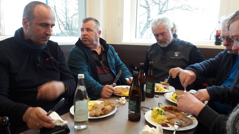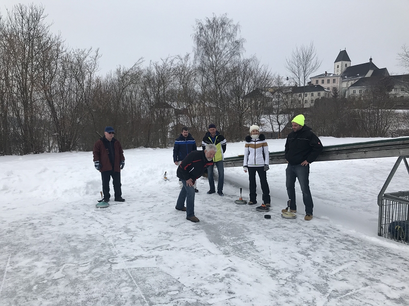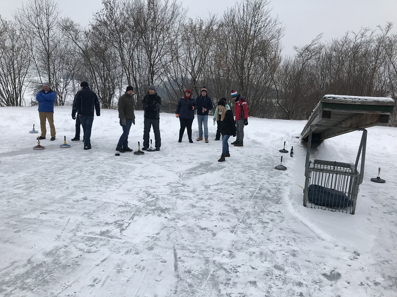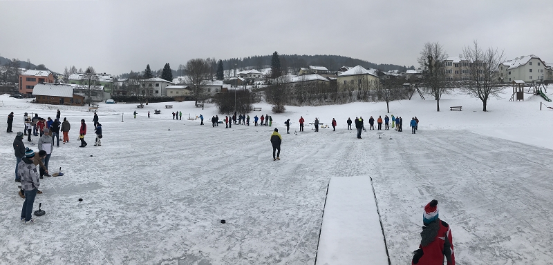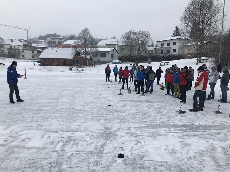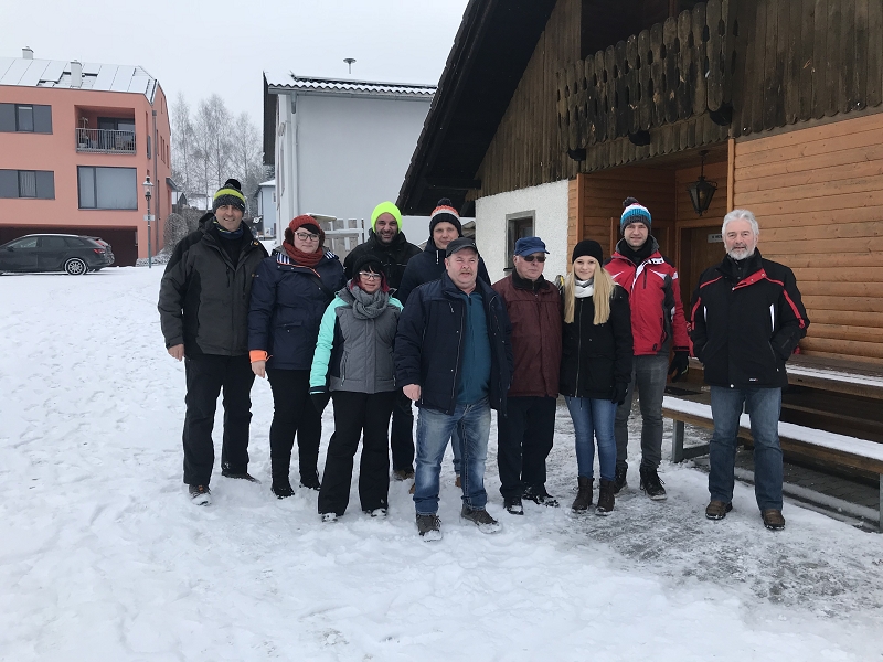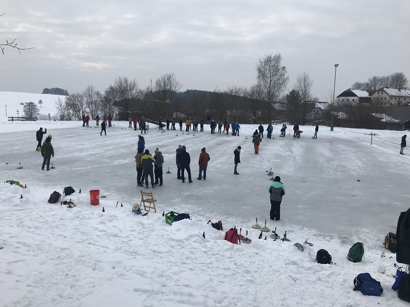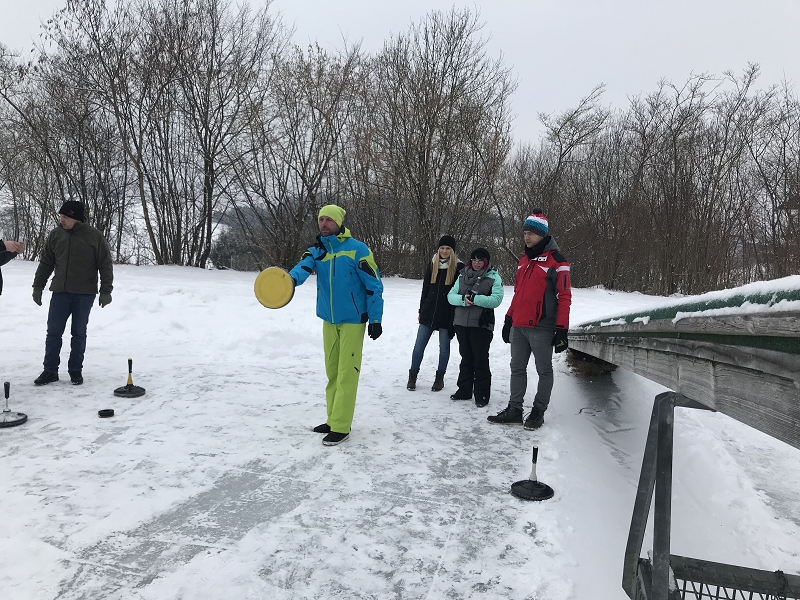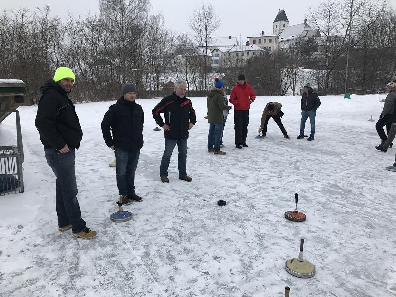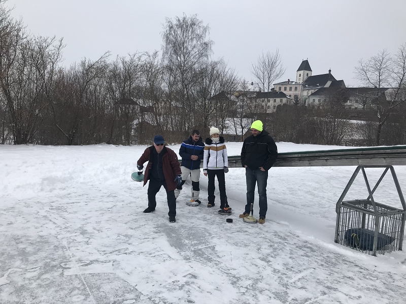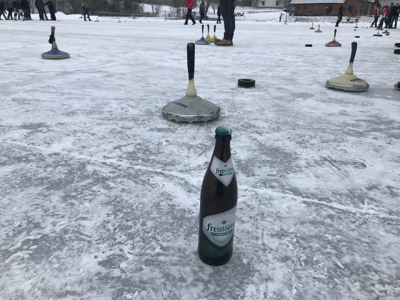 Am nächsten Tag nahmen wir am Eisstockschießen-Vereinsturnier der Gemeinde statt. Was es nicht alles für Vereine in Grünbach gibt. Junggesellenverein, wo keine Junggesellen drin sind, Abwasserverein, Montagsbrückenverein- wo jeden Montag an der Ortsbrücke gemeinsam ein Bier getrunken wird und ein Internetverein. Wir jedenfalls konnten unsere fehlende Erfahrung im Eisstockschießen nicht verbergen und belegten den letzten und vorletzten Platz, aber errangen erneut einen Sieg gegen die Alteingesessenen, was sich wie Nadelstiche für unsere Gegner anfühlte.