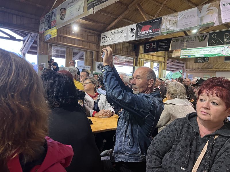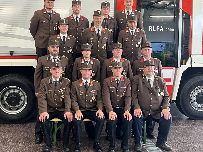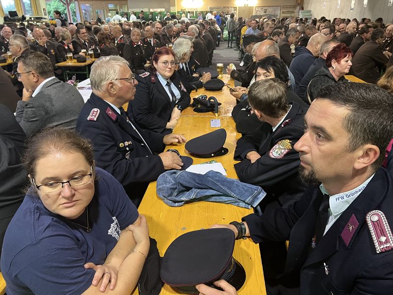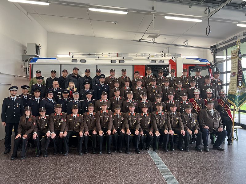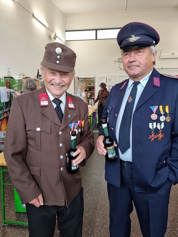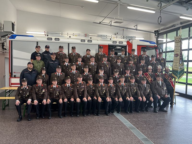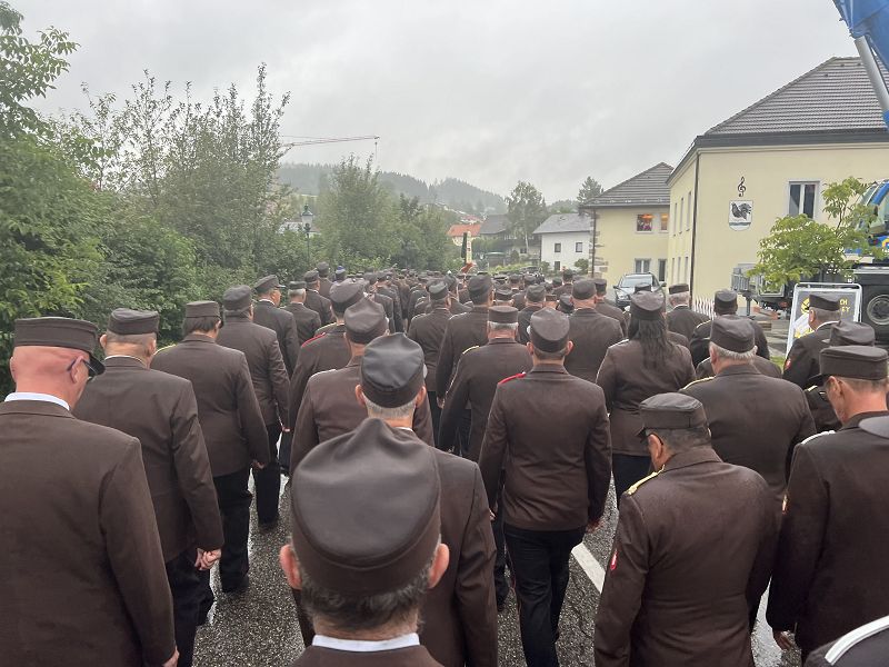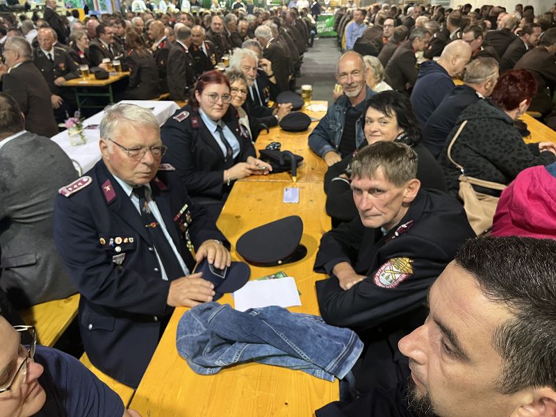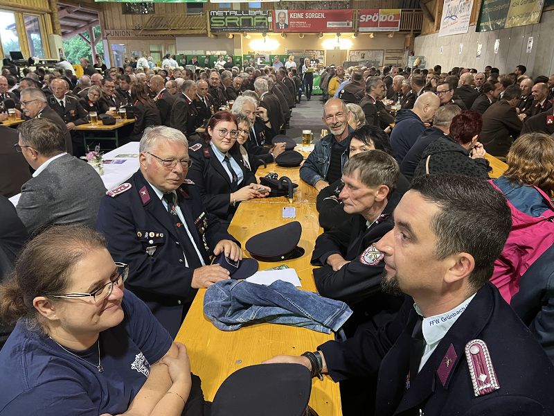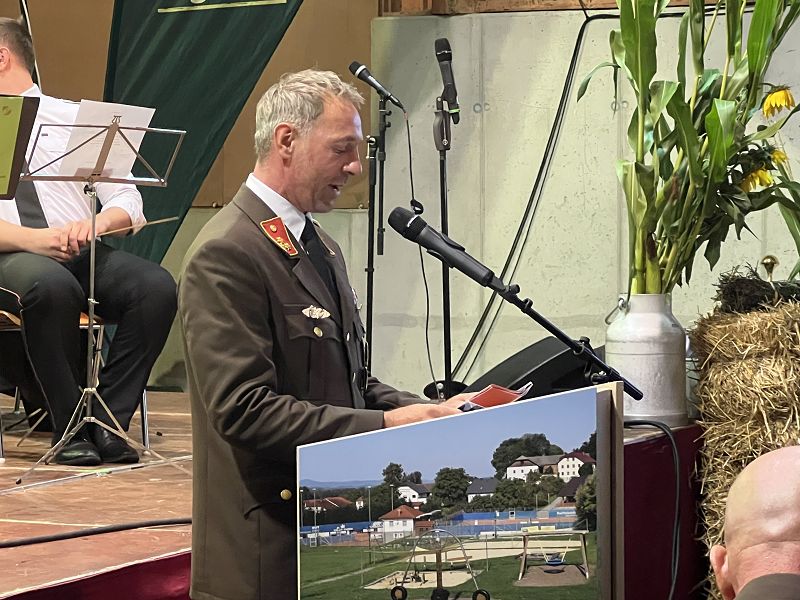 Im Marschblock zogen sie in die angrenzende Eisstockhalle ins Trockene um. Dort erhielt nach einigen Festreden der Komandant Roman Primetzhofer die höchste Auszeichnung der Gemeinde Grünbach, die Ehrenmedaille überreicht. Mehr als verdient meinten alle, nur sah das der Komandant nicht so! Er legte großen Wert drarauf, seine gesamte Mannschaft in die Auszeichnung einzubinden, sprich sein Komando, die Feuerwehrkameraden und deren Familien.