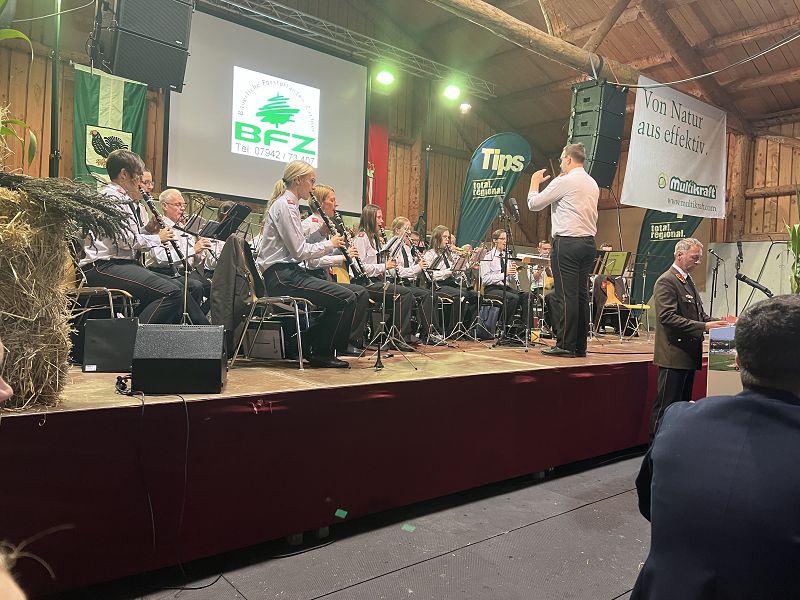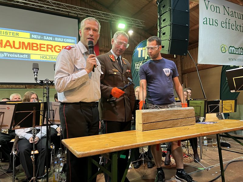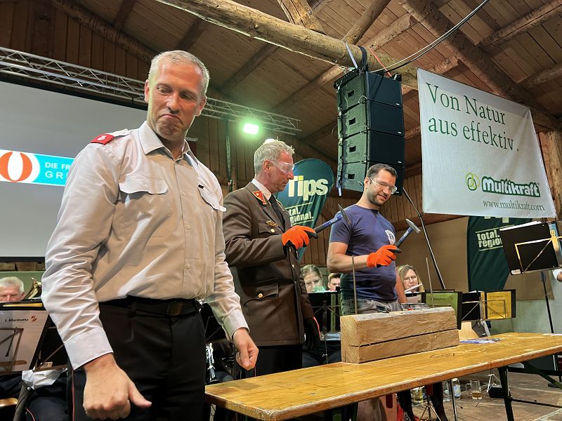 Die Blaskapelle aus Windhaag führte durch den Festabend und zwang die Chefs beider Grünbacher Wehren zum Rhytmustest. Nach zünftiger Musik mussten beide im Rhytmus Nägel einschlagen, was den eigentlich unmusikalischen Wehrführen gut gelang! Einige Doppelliter Bier aus Dank für die tolle Musik auf der Bühne kam von etlichen Sponsoren aus der Gästeschaft!