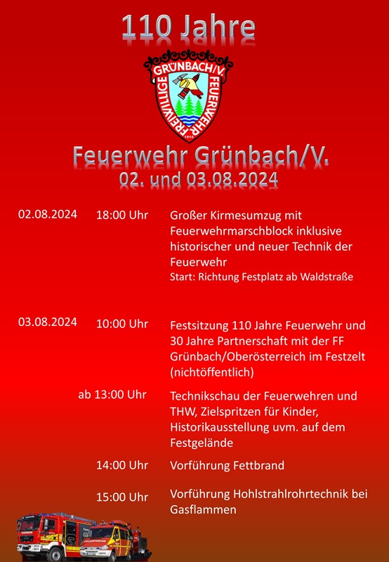 Es werden alle Feuerwehrfahrzeuge aus der Geschichte unserer Feuerwehr im Umzug dabei sein. Neben der Blaskapelle aus Oberösterreich werden wir auch von der Feuerwehrblaskapelle aus Carlsfeld begleitet. Im Umzug dabei sind auch alle Grünbacher Vereine, die Gemeinderäte unter Führung unseres Bürgermeisters Ralf Kretzschmann und natürlich unsere Partnerfeuerwehr aus Österreich.