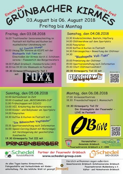 Die langen Tage der Grünbacher Kirmes stehen dieses Jahr unter der Schirmherrschaft der Feuerwehr mit der Gemeinde Grünbach. Das neue Kirmes-Organisationsteam hat sich eine Menge für die anspruchsvollen Tage ausgedacht. Und sie haben die langjährige Tradition wieder aufleben lassen, an den ersten Tagen Bands vertraglich zu binden, die in der Region eher unbekannt sind. Man darf also immer gespannt bleiben! Natürlich darf der traditionelle Faßanstich des Bürgermeisters am Kirmesfreitag nicht fehlen und auch die Blasmusik hat jeden Tag ihren festen Platz im Kirmesprogramm.