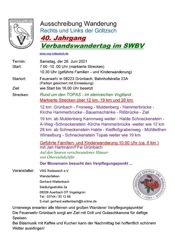 Einfach den Tag nur genießen, hieß es zur ersten Präsenzwanderveranstaltung im Vogtland, nach monatelanger Abstinenz und Kontaktverboten. Der sächsische Verbandswandertag wurde bereits im letzten Jahr durch die "Rodewischer Wanderfalken" vorbereitet und organisiert. Er konnte erst jetzt durchgeführt werden. Gleichzeititg feierten die engagierten Wanderfreunde ihr 40-jähriges Wanderjubiläum in Grünbach! Denn bis auf das letzte Jahr viel noch nie eine Wanderveranstaltung aus!