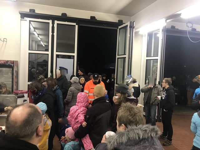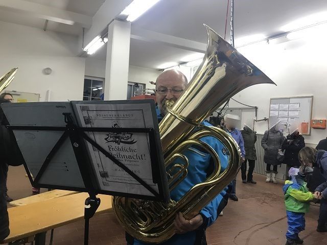 Die Bläser des Posaunenchors der landeskirchlichen Gemeinschaft spielte stimmungsvolle Weihnachtsmusik und wurden nur ab und zu vom Martinshorn des Feuerwehrautos gestört, welches seine stolzen Mitfahrer eine Runde durch unser Dorf fuhr! Und die Schlange der Interessierten Kinder riss einfach nicht ab, obwohl alle im Regen standen.