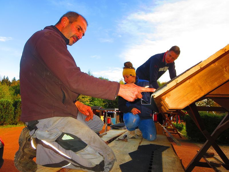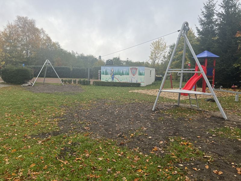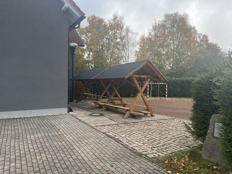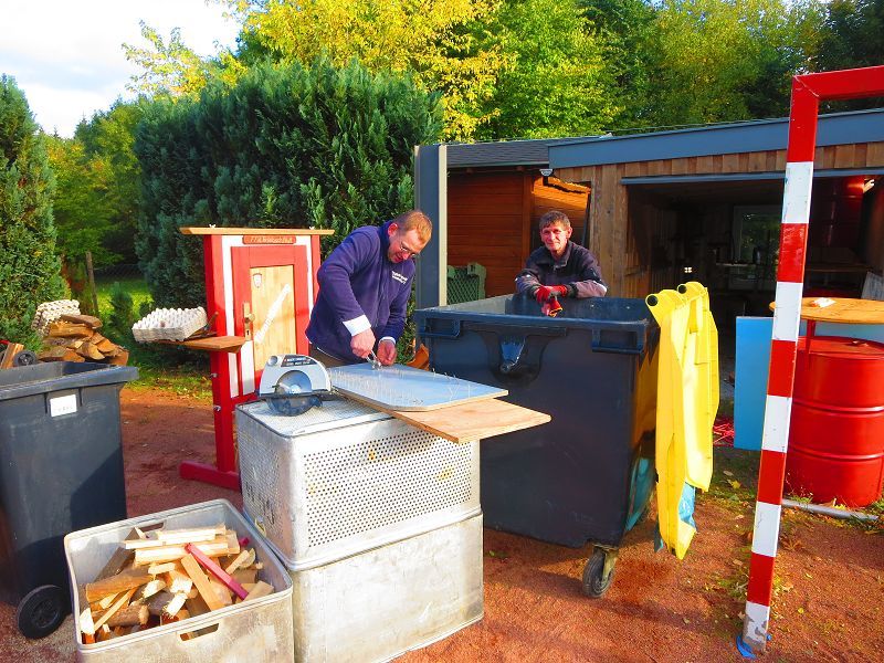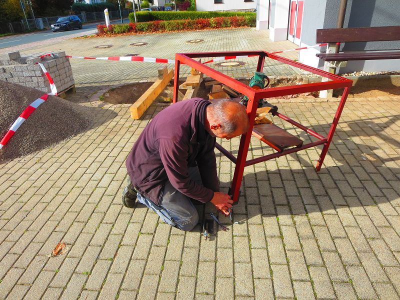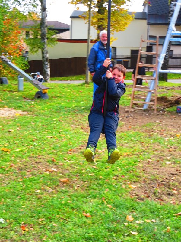 So wurde die Sitzgruppe hinter dem Feuerwehrhaus durch neue überdachte Sitzgruppen ersetzt, welche vorher noch mit Bitumenschindeln gedeckt werden mussten. Die Vereinsgaragen wurden alle auf Vordermann gebracht, um auch der Feldküche wieder ein passendes Winterquartier zu ermöglichen. Im Eingangsbereich entstand eine gepflasterte Aufstellfläche für eine Weihnachtspyramide. Diese hatte der Feuerwehrverein käuflich erworben. Die Elektrik wurde bereits verlegt und ist noch bis zum ersten Advent anzuschließen. Highlight in diesem Einsatz war jedoch die Fertigstellung der Seilbahn am Spielplatz der Feuerwehr. Durch Spenden und Förderung unterstützt gelang es dem Verein ein in Grünbach einmaliges Spielgerät aufzustellen. Bald können alle kleinen Besucher sich von der Startrampe in das gespannte Drahtseil stützen und zum Boden gleiten. Viel Vorarbeit in Sachen Fundamente und Montage waren nötig, doch nun konnte der Probebetrieb erfolgreich durchgeführt werden. Noch ist die Anlage gesperrt, um dem Rasen eine Chance zum Wachsen zu geben!