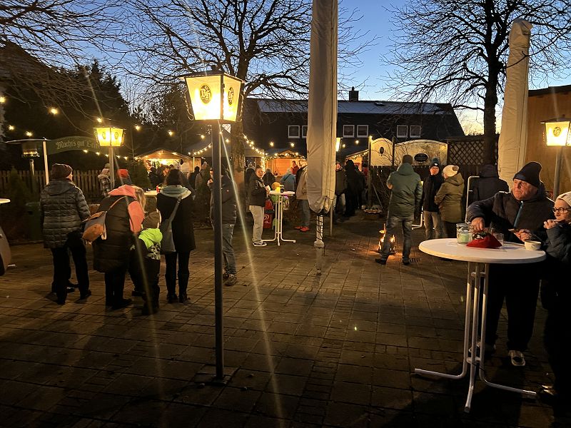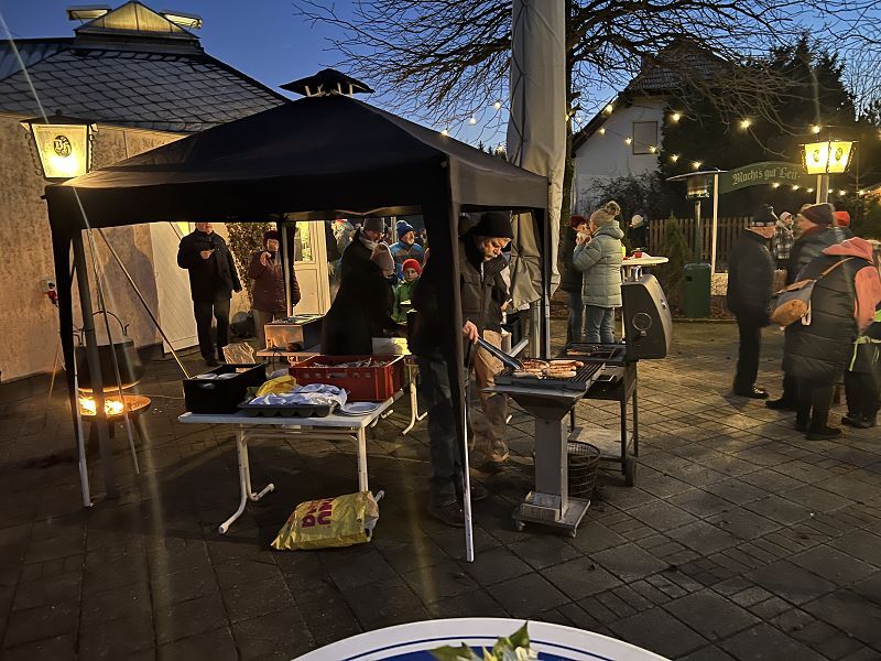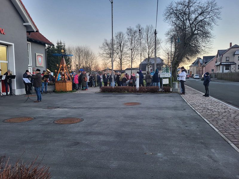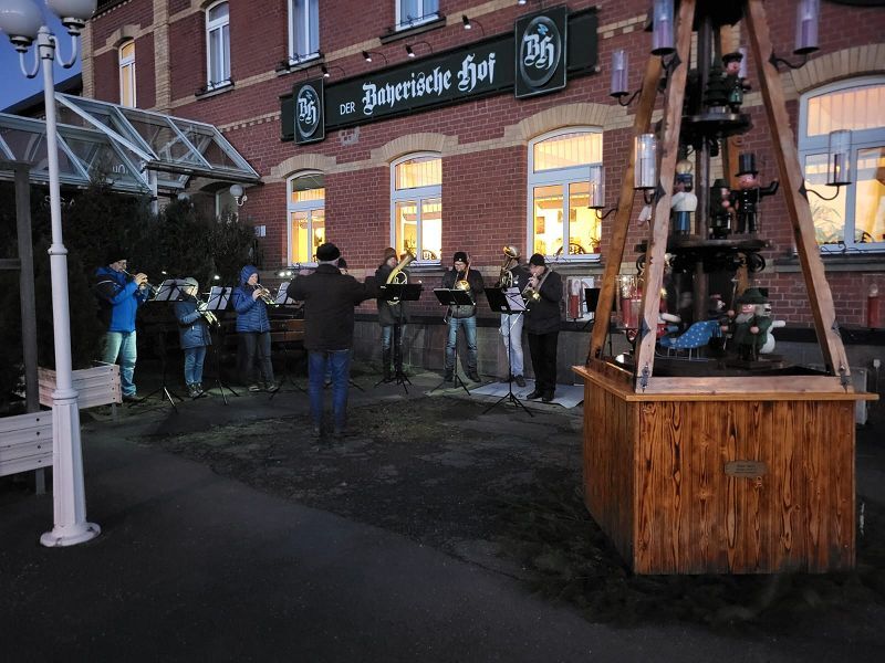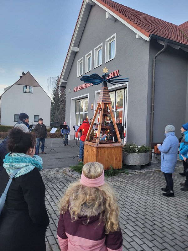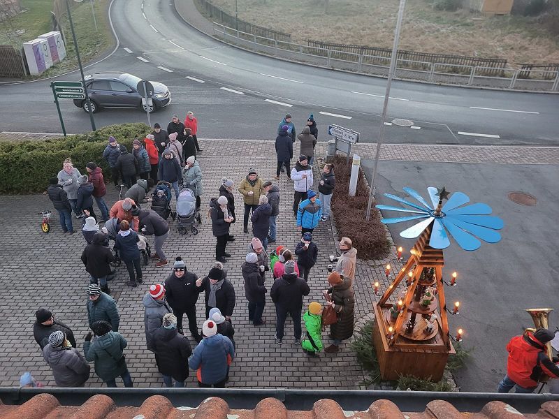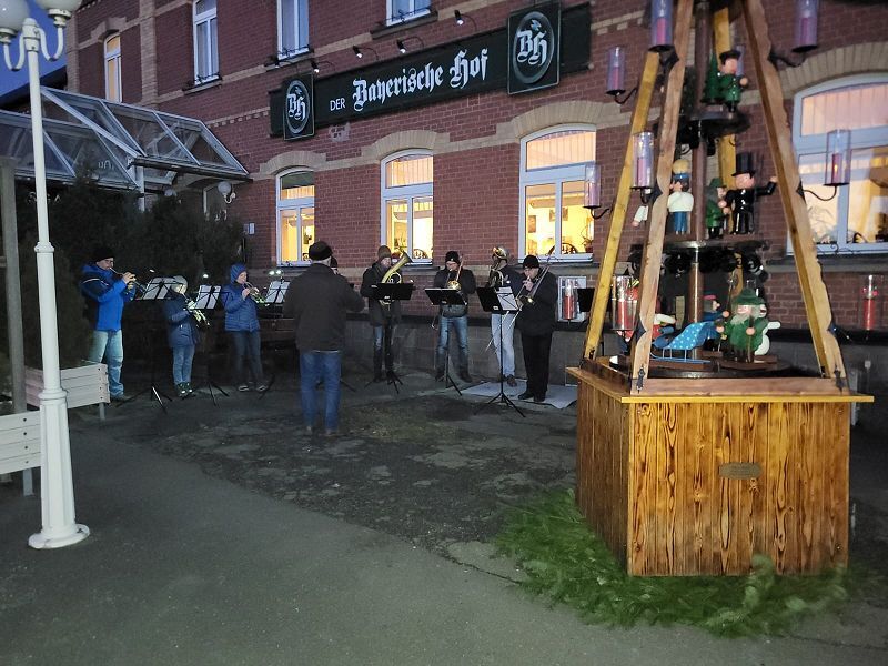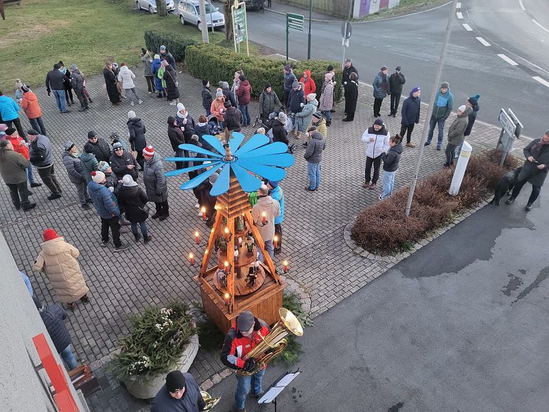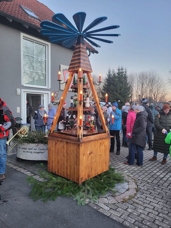 Dann zogen alle durch die bereits zauberhaft geschmückte Krumme Straße zum "Hotel Bayerischer Hof". Dort überraschten die Gäste ein liebevoller kleiner Weihnachtsmarkt mit Budenzauber, Lagerfeuer und frischen Duft von Bratwurst, Soljanka und heißen Getränken. Unterstützt durch die Gemeinde Grünbach und einigen Vereinen unserer Dorfgemeinde wurde auch hier der Drehturm feierlich in Gang gesetzt und kann nun für die nächsten Wochen seine Runden drehen. Dabei wurde auch ein tolles Festprogramm durch Kinder der KITA und durch Weihnachtsmusik des Posaunenchors gezeigt.