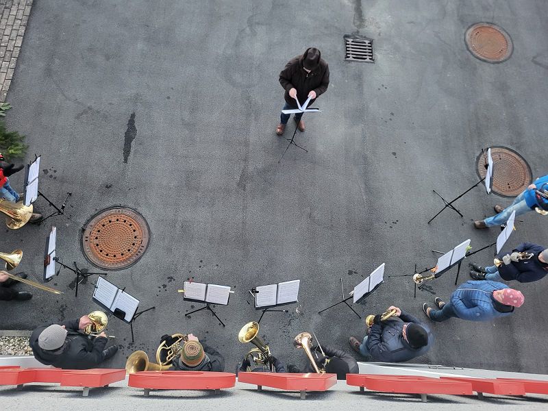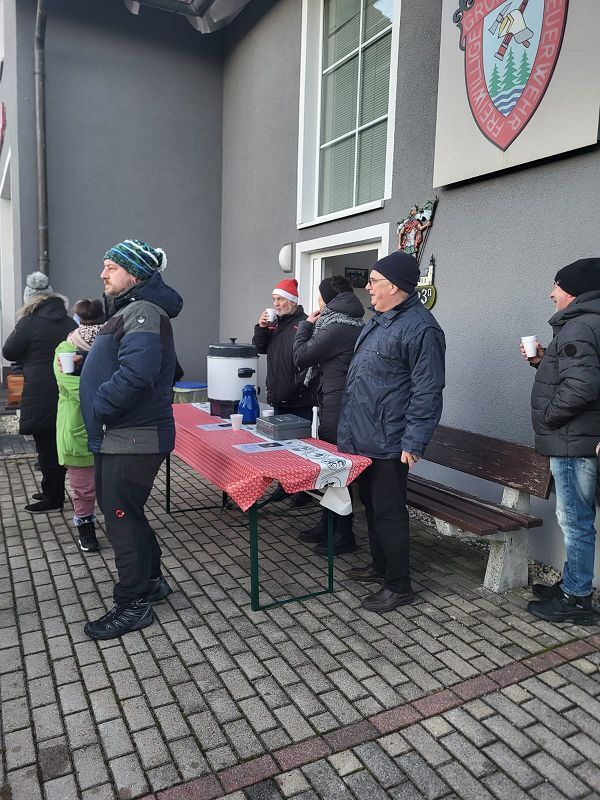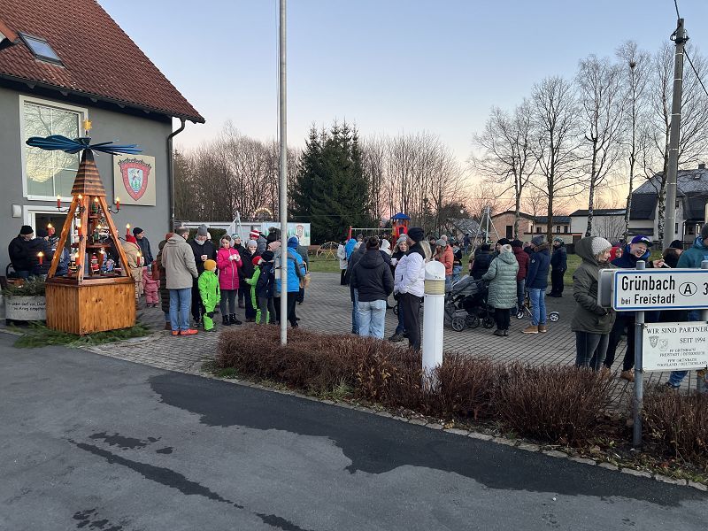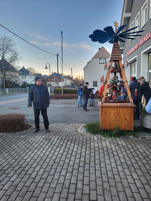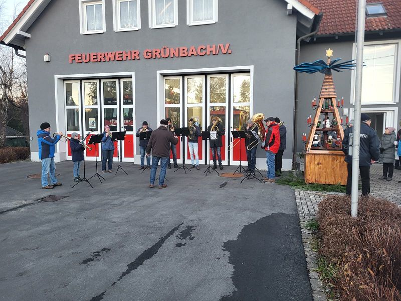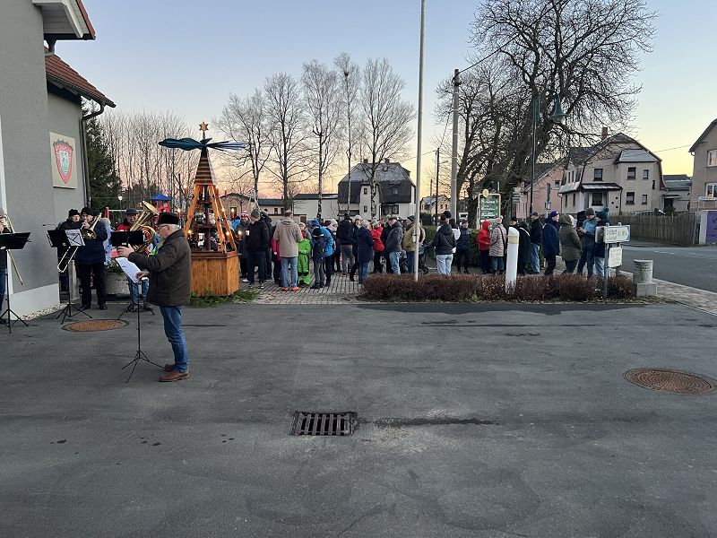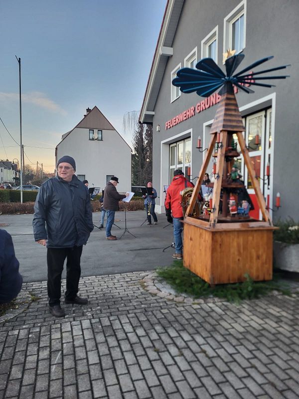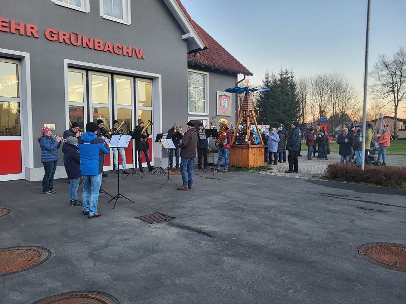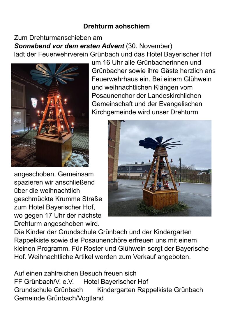 Die beiden öffentlichen Drehtürme wurden nun schon zum dritten Mal angeschoben- oder besser wie dr Vugtländer sogt- oahgeschum! Los ging es am Drehturm der Freiwilligen Feuerwehr, wo sich bereits viele Grünbacher zu einem Becher Glühwein einfanden und den Klängen des Posaunenchors der evangelischen Gemeinde lauschten.