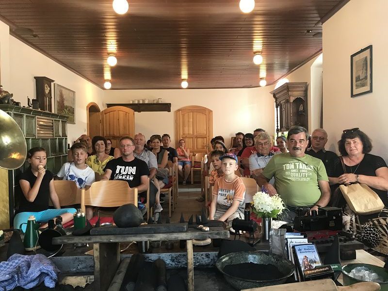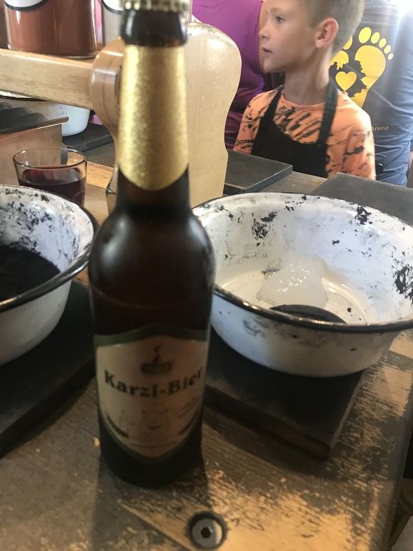 Wir wollten uns in die Geheimnisse des original "Weihrichkarzl" einweihen lassen. Dafür ging es in die "Hexenküche" von Kurt Huss, dem Begründer der Neudorfer Karzlherstellung- seit 1930! Ausgestattet mit schwarzen Kittelschürzen tauchten die Hände aller Vereinsmitglieder in die Emailleschüsseln. Diese waren gefüllt mit feinsten Buchenholzmehl, welches vorher Grillkohle war. Das Bindemittel, die Kartoffelstärke überraschte die meisten Hobbyköche, mehr war nicht drin in den Weihrichkerzln. Na doch, Vanillezucker, Weihrauch, Benzoe und der selbst gewählte Geruchsstoff ergänzten das Breigemenge. Dieses musste dann zu einem Teig geformt und als Kuchen ausgerollt werden. Der größte Spaß für Groß und Klein und so manche schwarze Hand landete zum Schweiß abwischen im Gesicht oder versehentlich an der weißen Hose.