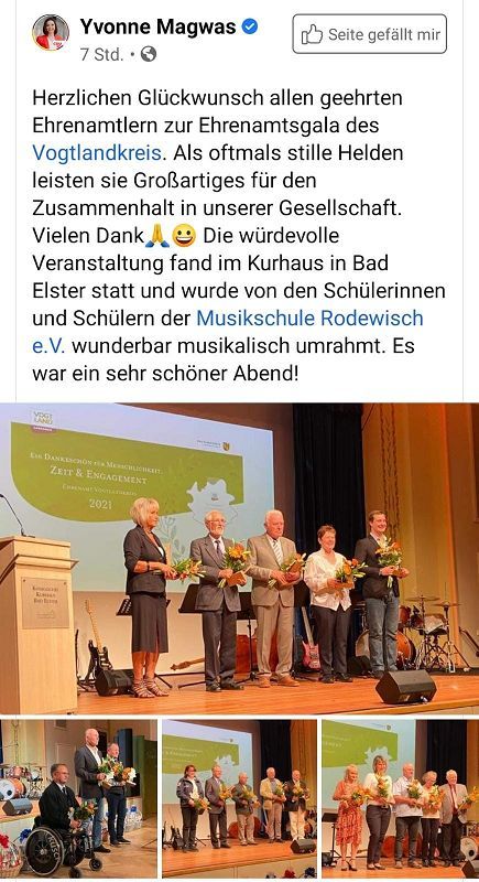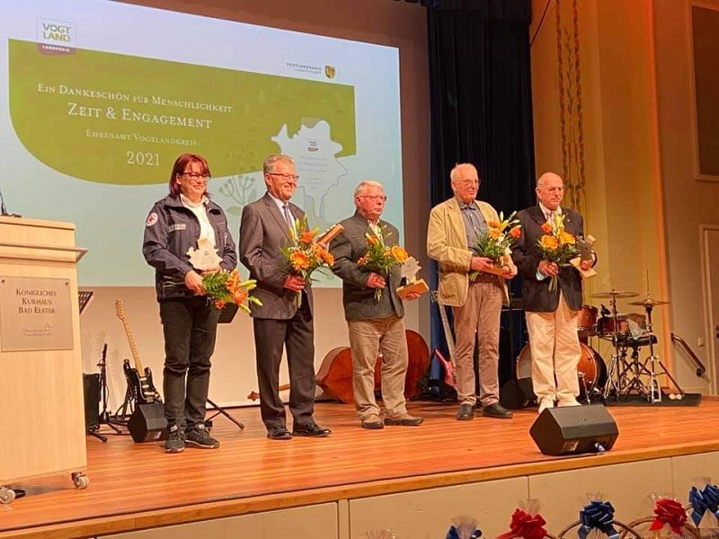 Im einem festlichen Rahmen, dem Kurshaus Bad Elster, zeichnete der Vogtlandkreis einige verdiente Bürgerinnen und Bürger, welche fast ihr ganzes Leben in ihre ehrenamlicht Tätigkeit investierten aus. Mit dabei uns Feuerwehr-Altkamerad Roland Blechschmidt! Er war nicht nur sein ganze Leben Feuerwehrmann, sondern hat auch den Feuerwehrverein Grünbach als Vereinsvorsitzender auf die Beine gestellt und Jahre lang am Leben gehalten. Das sind Verdienste für die Geschichtsbücher und deshalb ist es mehr als verdient, diese Auszeichnung an Ihn zu vergeben. Auch der jetzige Vereinschef Werner Günther war neben viel Politprominenz unter den Gästen.
