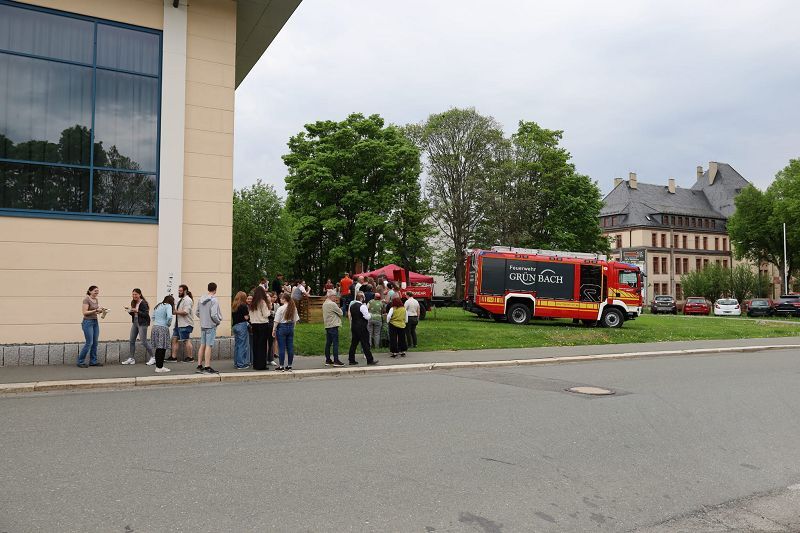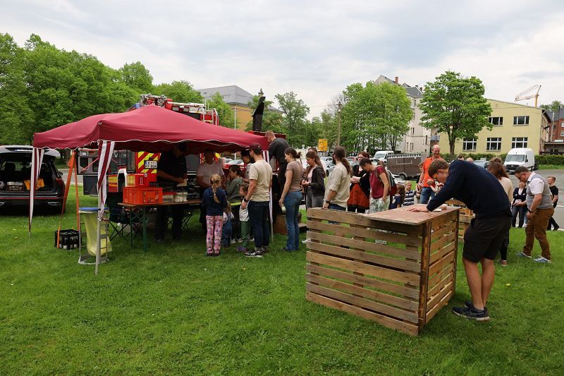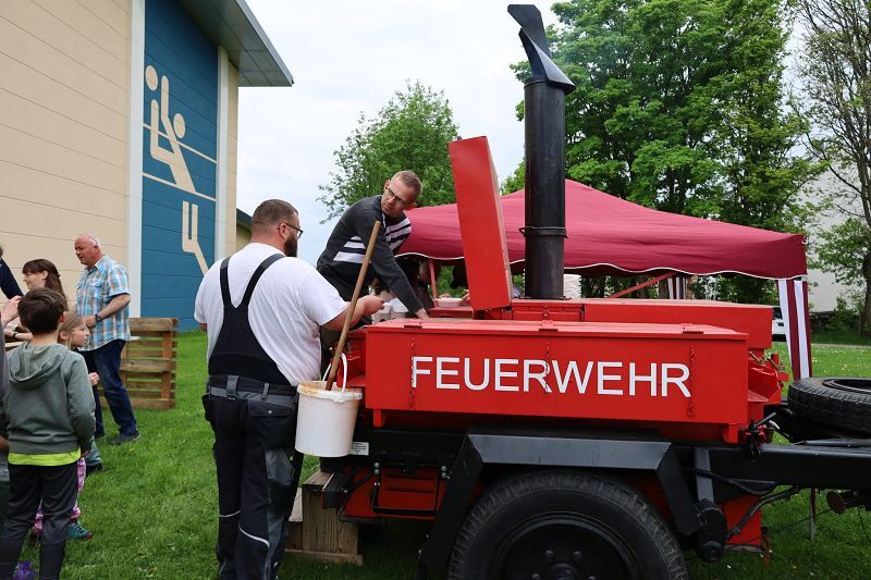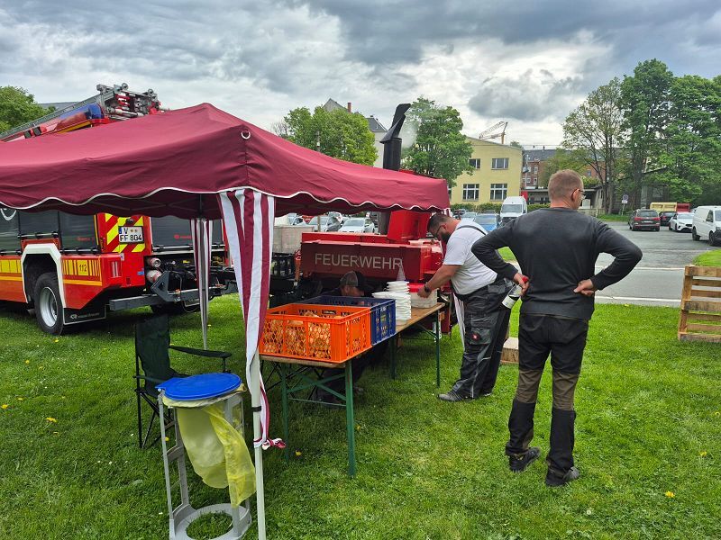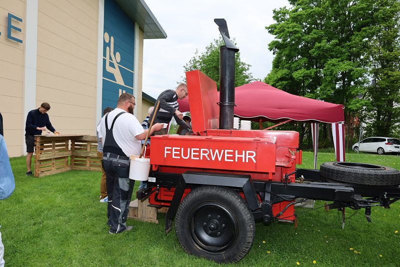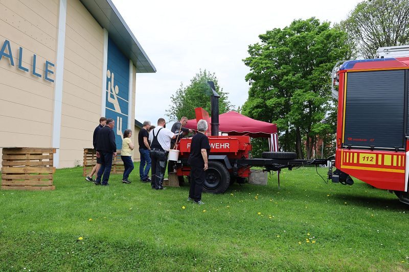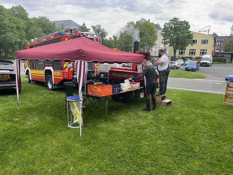 An diesem Samstag hieß es Danke zu sagen, all jenen, die über die vielen Jahren zum Erfolg dieser Musicalarbeit beigetragen haben. Und diese Dankeschönveranstaltung fand in der Sporthalle Falkenstein mit über 200 geladenen Gästen statt. Zur Mittagszeit sollten dann die "hungrigen Mäuler" möglichst schnell zufrieden gestellt werden. Aus diesem Grund fragten die Organisatoren Jan Hartmann von der Grünbacher Feuerwehr an und der hatte schnell für diesen Einsatz ein Team gefunden. Nach den anstrengenden Höhenfeuertagen in Vorbereitung und Durchführung, war das nicht selbstverständlich. Doch für diesen Einsatz waren wir dann doch sehr motiviert, einen kleinen Baustein für diesen Abschluß beigetragen zu haben. Schnell waren dann die rund 220 Portionen Kesselgulasch an die Frau und den Mann, sowie den vielen Kids gebracht und viel Lob beim Nachschlagholen empfangen worden.