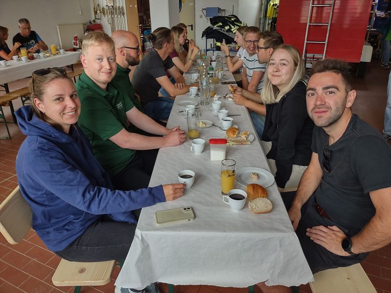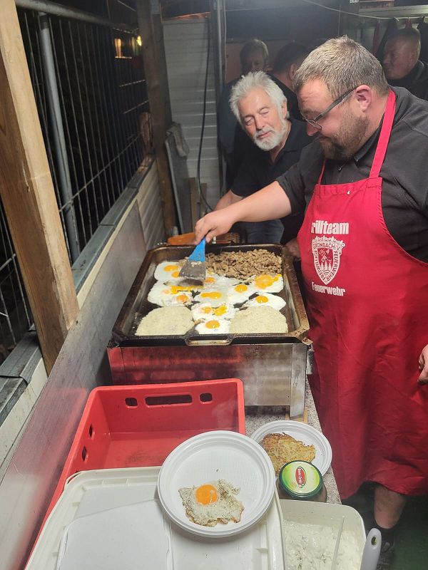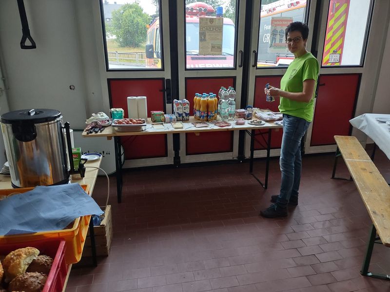 Die jugendlichen Blasmusikanten aus Österreich und Feuerwehrkameraden aus Hohenstein-Ernstthal und Großobringen in Thüringen übernachteten auf Feldbetten im Feuerwehrhaus und im ehemaligen Café-Bohne! Um 07:30 rückten die ersten dieser Gästen zum Frühstück in die liebevoll eingerichtete Fahrzeughalle der Feuerwehr ein! Das Frühstücks - Buffett, organisierte von der Familie Kreißl, Wolf und Körner lies keine Wünsche offen! Die frisch gekochten Eier kamen wiederrum vom Bayerischen Hof, denn wer hat schon die Möglichkeit 40 Eier auf einem Mal zu kochen! Vielen Dank an alle - die Gästen sparten nicht mit Lob!