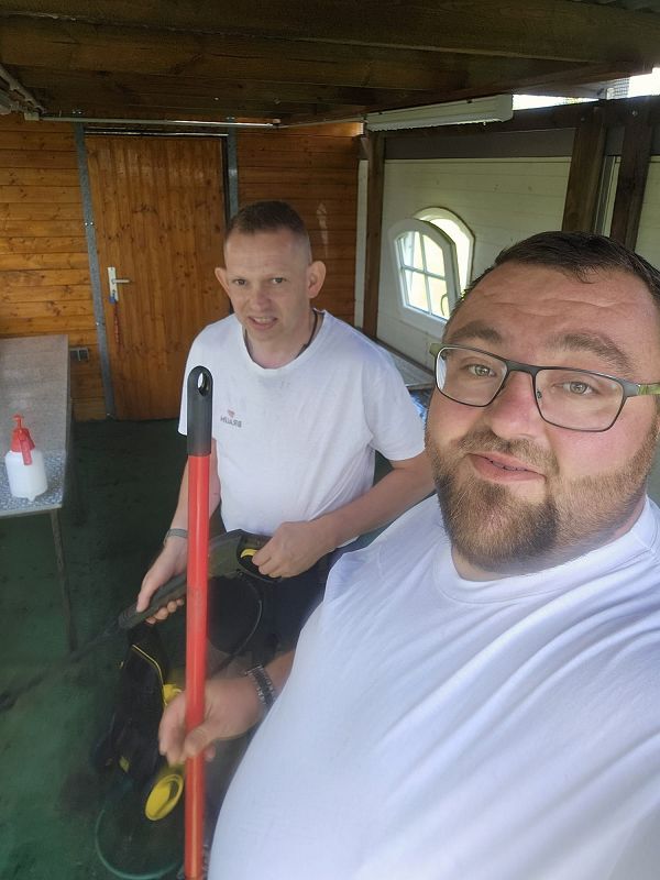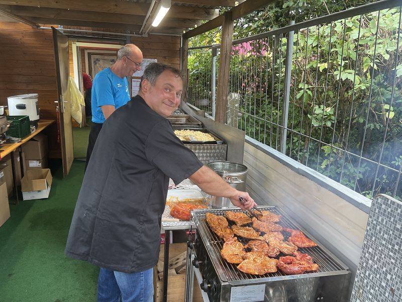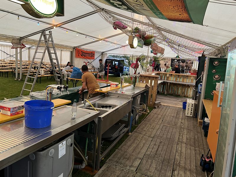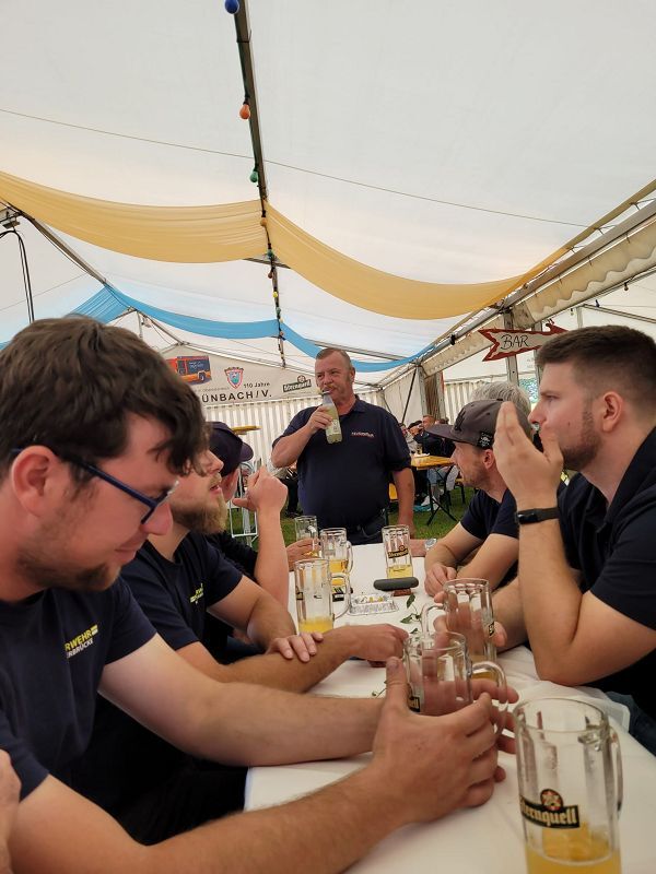 Die Grillbude wurde mit Hochdruck-Kärcher grundgereinigt, mehr als 25 Helfer stellten das große Bierzelt auf und begann mit dem Schmücken! Der Wirt vom Bayerischen Hof - Steffen Manthey kochte aus unserem erworbenen Wild eine lecker Wildgulaschsuppe kostenfrei für die Feuerwehr! Klasse! So dass in diesem Jahr sogar zwei Suppen im Speisenangebot standen. Die Firma Remondis kam mit großer Technik und stellte einen Müllcontainer unkompliziert auf. Die Elektriker der Firma VMB-Elektroanlagen mit Chef und Vizebürgermeister Karsten Voll zogen kilometerlange Kabel über den Festplatz und versuchten einen störungsfreien Betrieb zu ermöglichen, was bei dem immer mehr steigenden Strombedarf immer schwieriger wird! Die Klempnerei Marosi verlegte die Wasser- und Abwasserleitungen! Heiko Lienemann von der Reiterpension bereitete die Nudeln für die Feuerwehr kostenfrei vor, welche Chefköchin Nancy Jacob mit ihrem Grillteam zu schmackhaften Nudeln mit Wurst und Käse verzauberte. Mehr als 10 Gerichte standen auf der Speisekarte! Täglich über 10 Helfer stellten Fischsemmeln her und betreuten den wundervoll geschmückten Verkaufsstand! Bowle-Chefin Lydia Buchheim hatte mit ihrem Team schon am Sonntag Mühe das gesamte Sortiment an Bowle anbieten zu können, so gut war der Absatz an den beiden Vortagen. Engpässe auch am Essensstand, ob des großen Absatzes am Freitag und Samstag! Deshalb war auch der Gyros am Sonntag vorübergehend nicht mehr lieferbar! In der Bäckerei Frisch herrschte eigentlich Urlaubsstimmung und doch brannte jede Nacht ab 03:00 Uhr Licht. Altgeselle Jan Hartmann backte die Grünbacher Semmeln, in den ersten Tagen sogar von Feuerwehrkamerad Gerd Kreißl unterstützt! Die Semmeln wurden an jedem Tag am Speisenhäuschen gelobt! Ständige galt es Waren anzukarren, Helfer von zu Hause auf den Festplatz und umgekehrt zu fahren. Im Zweischichtsystem sicherten dies die Kameraden Daniel Kern, Sylvio Rosenbaum und Max Hums ab! Dabei konnten sie kostenfrei auf einen Caddy der Firma Heine-Container zurück greifen. Vielen Dank für diese Unterstützung!