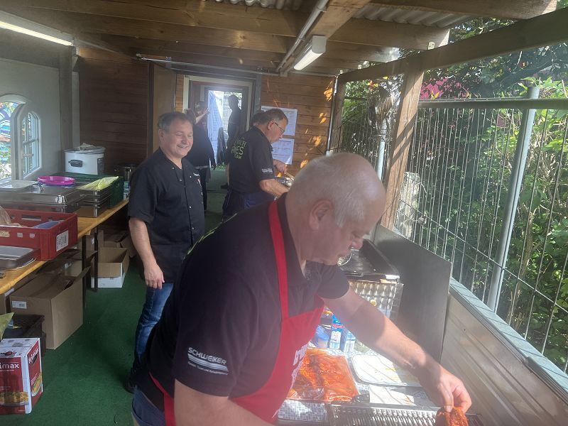 Ganz im Stillen, am Pfannenstiel rührte ein Mörtelquirl durch den frisch angesetzten Bambesteig. Die Familie Reuter und Hartenstein hatten unter der Führung von Anja Hartenstein alle Hände voll zu tun, den Teig für die Bambes zuzubereiten. Das Rezept bleibt geheim, Lob gab es auch hier von allen Seiten! Super!