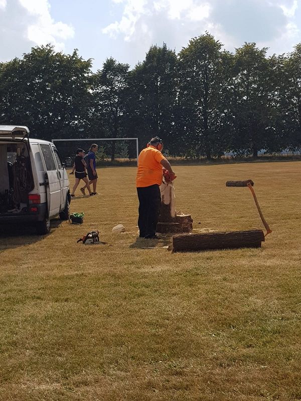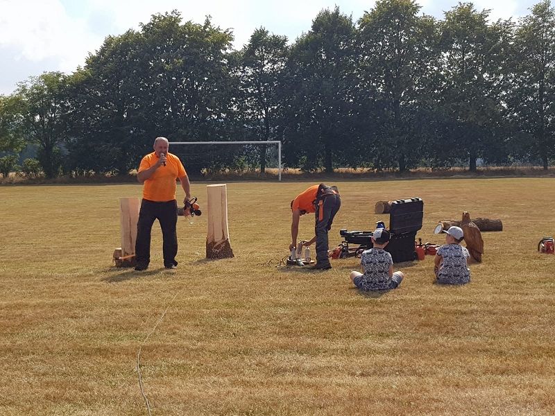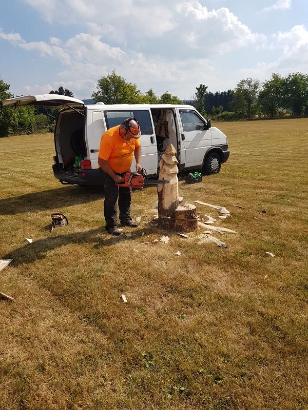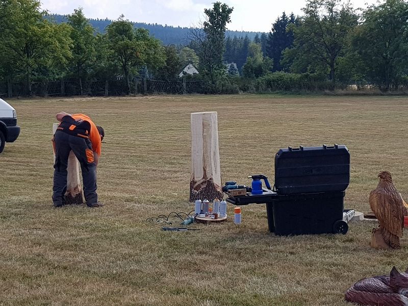 Im Kettensägenlärm schnitzten 6 Künstler in der prallen Sonne des Festplatzes ihre Figuren. Es entstanden Adler, Eulen und vieles mehr. Das meiste fand bei der anschließenden Versteigerung einen neuen Besitzer!