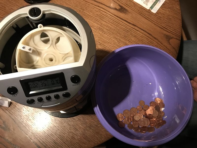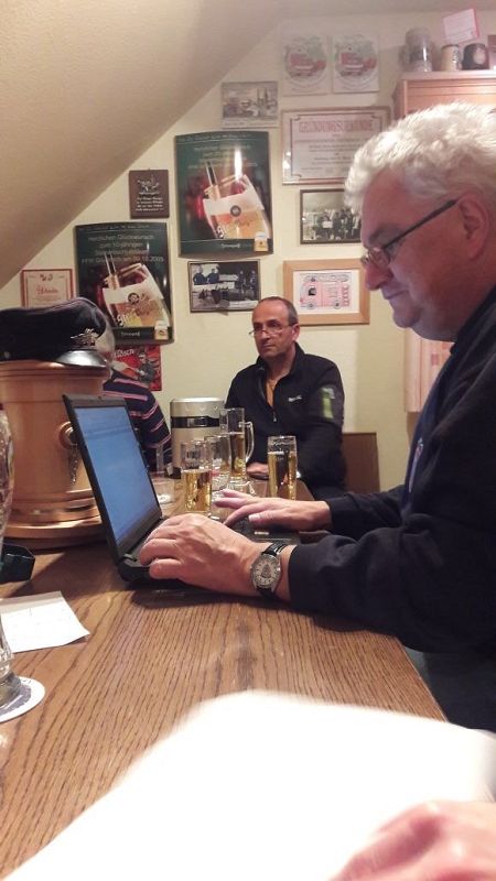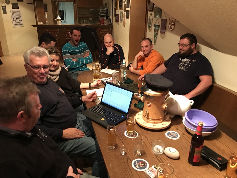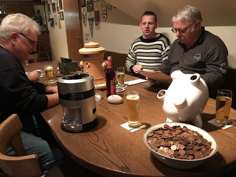 Seit Jahren frisst ein Porzellanschwein im Feuerwehrhaus alle Kleinmünzen von 1 Cent bis 5 Cent, welche beim Zahlen am Stammtisch anfallen. Der Hunger war schier unersättlich! Über Jahre nahm es tapfer jede Kupfermünze auf und manchmal war auch ein 10 Cent-Stück oder eine noch größere Münze dabei, wenn es auch eine Ausnahme war. Jetzt war keine Münze mehr hineinzudrücken! Zeit das Schwein endlich zu schlachten! Vorher galt es aber für jeden Kameraden seinen Tipp zum Inhalt anzugeben. Dann wurde in einer gemütlichen Stammtischrunde mittels elektronischen Münzzählgerät die Unmenge an Münzen zur Zählung freigegeben. Wenn man auch manchmal glaubte das Geräte schnaufen zu hören, nach reichlich drei Stunden war das Ergebnis bekannt und wurde von den beiden "Unabhängigen notariellen Aufsichtspersonen" Kristin und Klaus schritlich und per EDV bekannt gegeben.