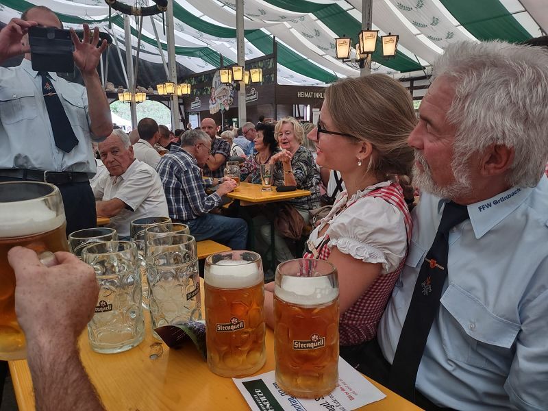 Die Grünbacher Feuerwehr wurde als langjähriger Kunde der Brauerei auch umfangreich von der Geschäftsleitung und den Brauereivertretern gepflegt und so kam der eine oder andere Getränkegutschein für die Grünbacher Partygäste in die richtigen Hände. 9,80€ kostete in diesem Jahr der Liter Oktoberfestbier. Viele von uns empfanden es nicht ganz so würzig und kräftig wie im letzten Jahr, aber süffig allemal!