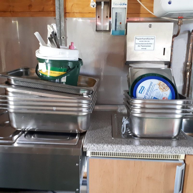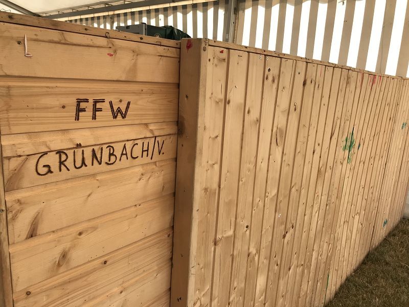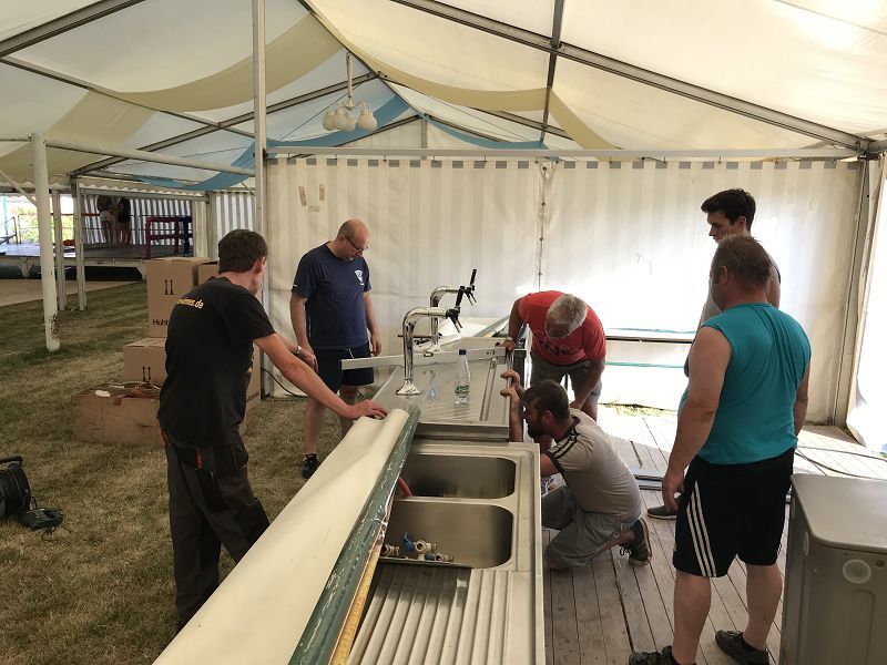 Die Feuerwehr legt unheimlich viel Augenmerk auf die Zeltgestaltung, das kostet natürlich Zeit! Aber auch hier sind wir am zweiten Tag gut voran gekommen, wenn auch noch nicht am Ziel! Da sind die Verantwortlichen der Grillbuden fast! Hochmoderne Kühltische, sowie Wärmetruhen warten zur Speisenbevorratung auf das erste Essen. Aus dem Warmwasserboiler fließt erstmals Wasser zum Spülen und Hände waschen!