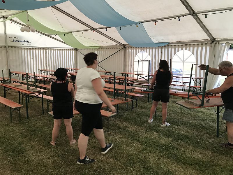 Tag zwei der Kirmesvorbereitungen - nachdem gestern schon die neue Bühne und Teile der Bar im Zelt verbaut wurden, rückten heute die Kameraden den ersten Bierzeltgarnituren auf den Leib. Auch die Wasserversorgung wurden verlegt und der neue Industriespüler erhielt seinen Anschluss!