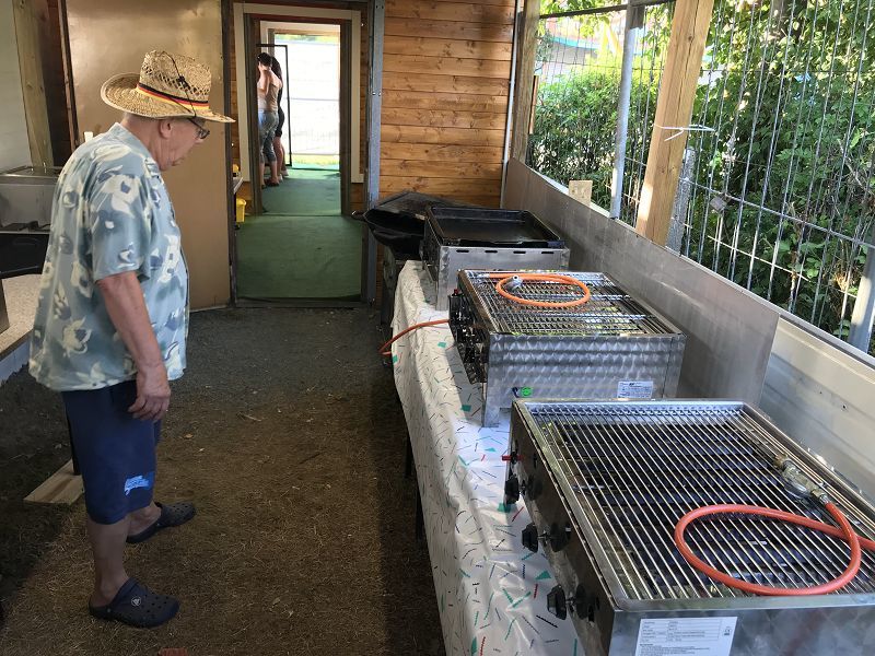 Die Grillstrecke ist auch schon aufgebaut, wenn man von einigen Feinjustierungen absieht. Vier Grills und drei Fritösen stehen den Helfern zur Zubereitung zur Verfügung. Deshalb konnten die vielen Helfer des heutigen Tages auch bereits mit ersten Speisen versorgt werden! Wann gab es das schon mal!