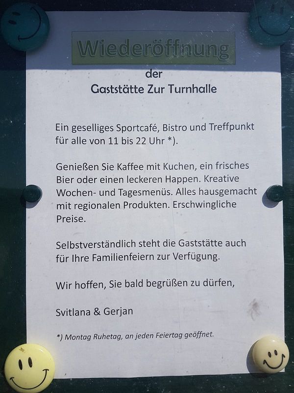 Es ist vollbracht! Alles hoffen und bangen nach einem neuen Betreiber für unsere Traditionsgaststätte am Sportplatz hat nun Erfolg! Seit gestern, anlässlich des Vereinsfestes der Grünbacher Vereine eröffneten Svitlana & Gerjan die Türen. Am Schaukasten haben die beiden schon alle Grünbacher über die Eröffnung informiert.